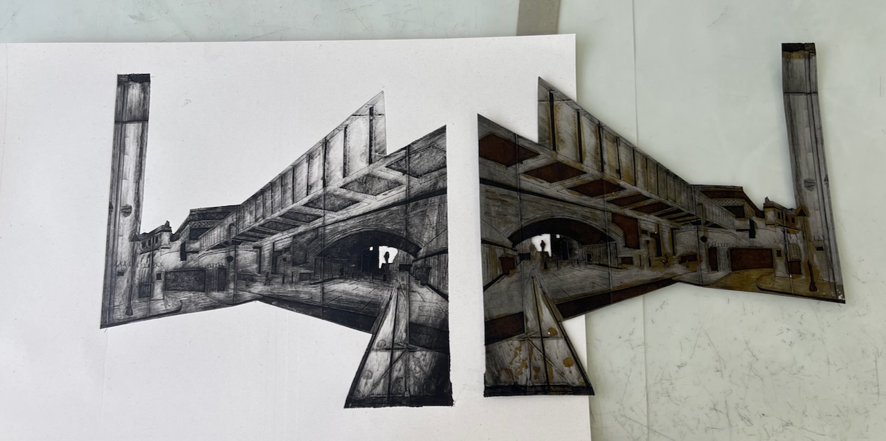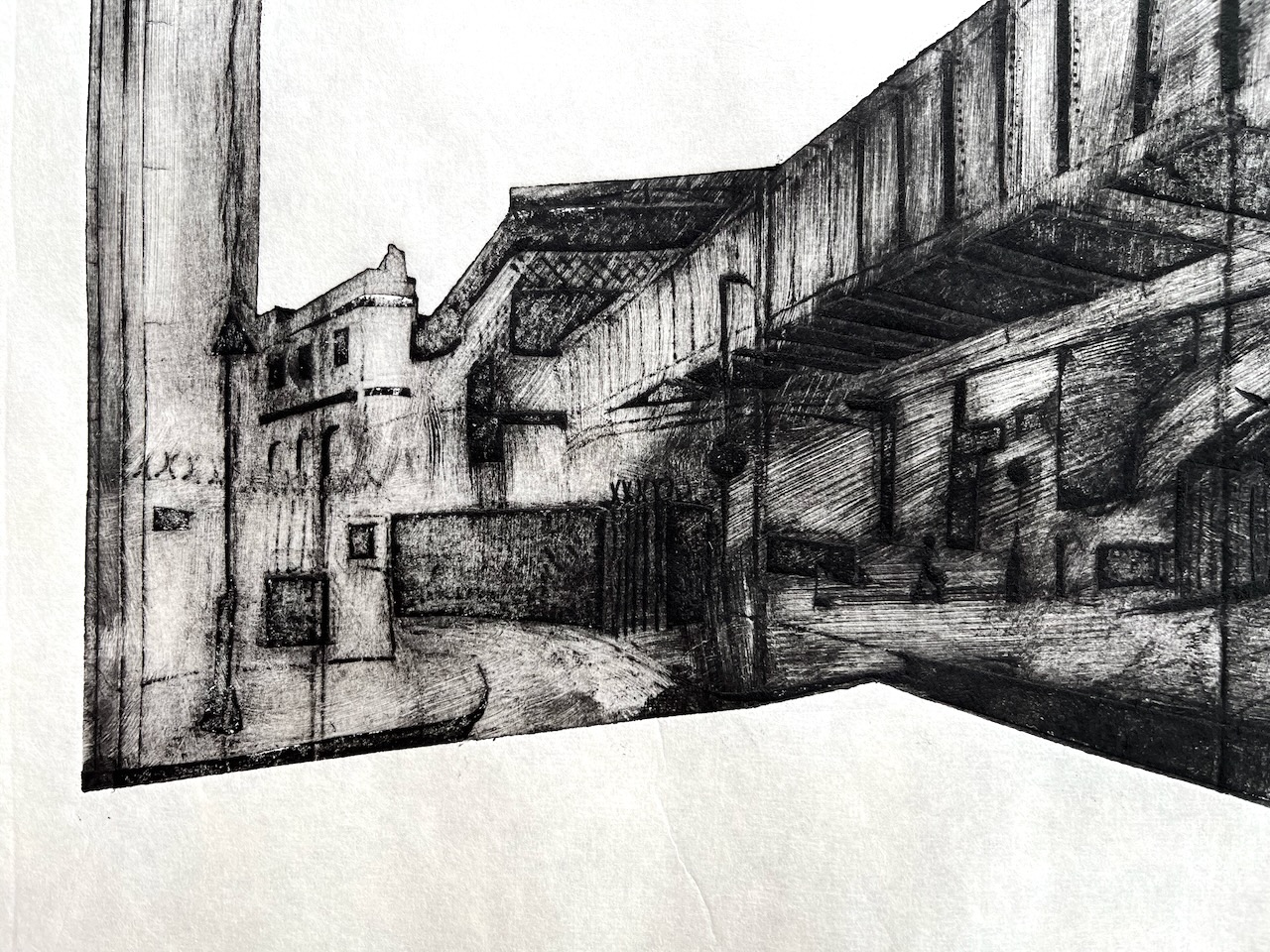 I used traditional etching ink, “Shop mix – Bone Black” from Intaglio Printmaker, whose shop, as it happens, is not far from this railway bridge.