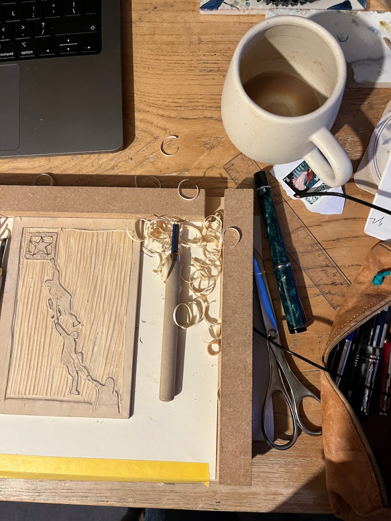 The main image is a woodcut on plywood. Here is work in progress: