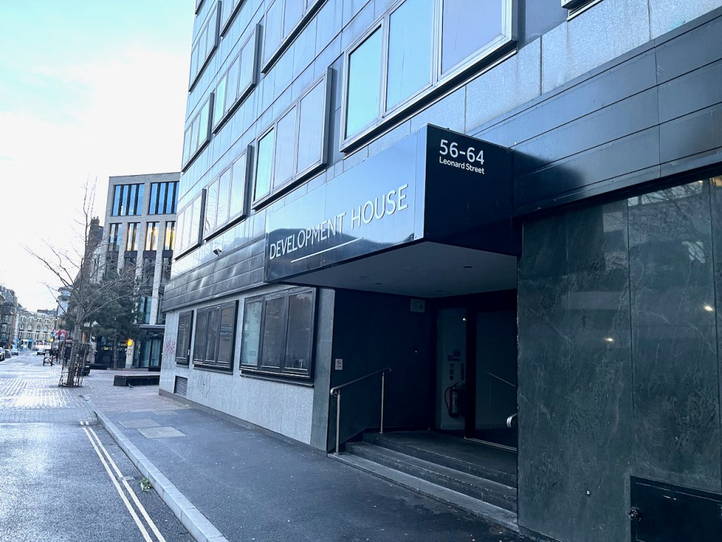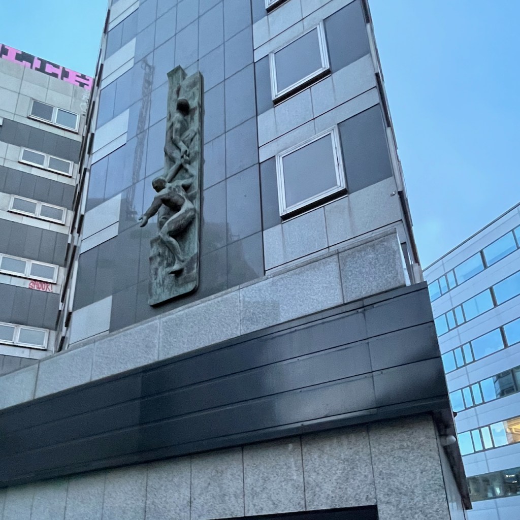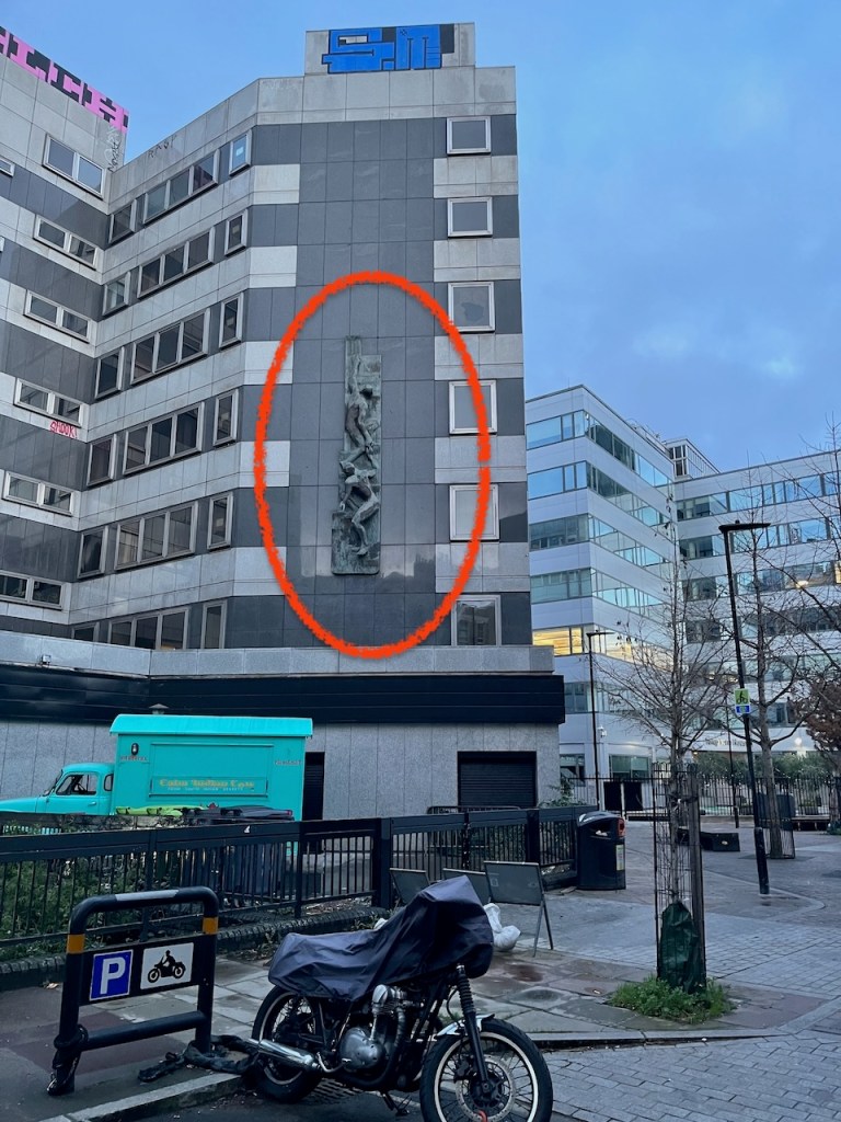 The woodcut image is inspired by a sculpture on the wall of a building in Hoxton. The building is called “Development House” 56-64 Leonard Street. I can’t find any attribution for the sculpture and would be interested to know who the artist is, if anyone can tell me.
