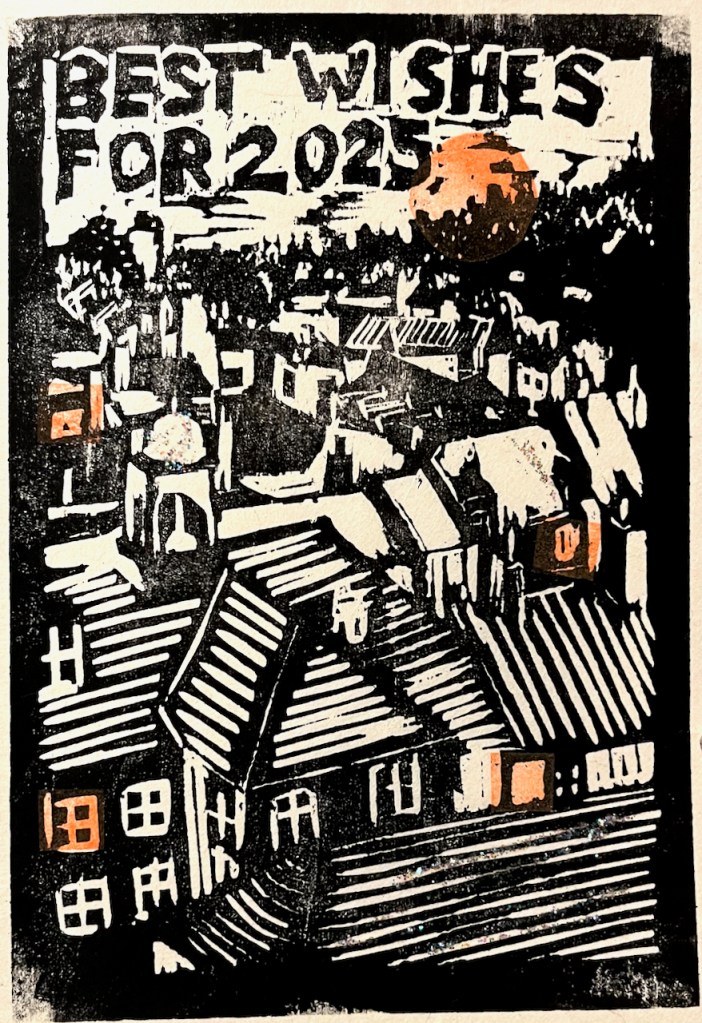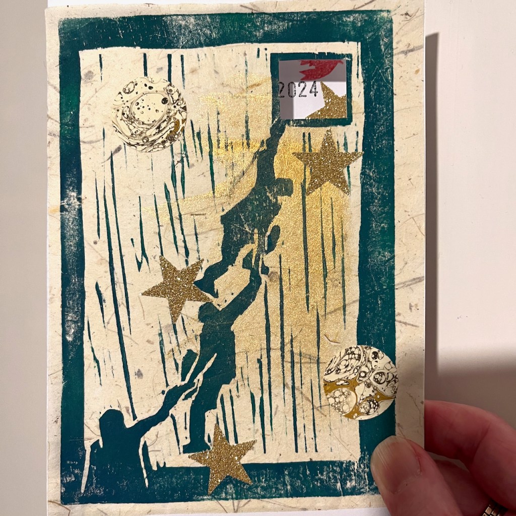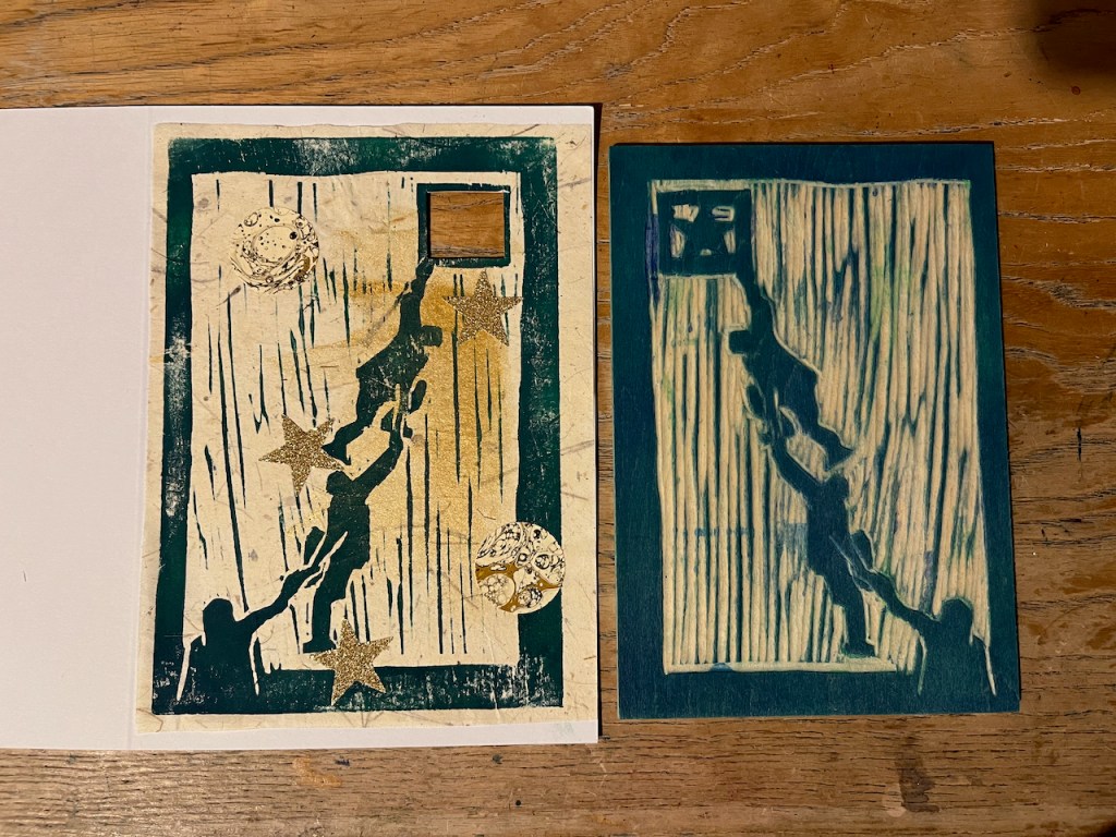 New Year 2024: “Ascent” woodcut and collage – 5″ x 7″