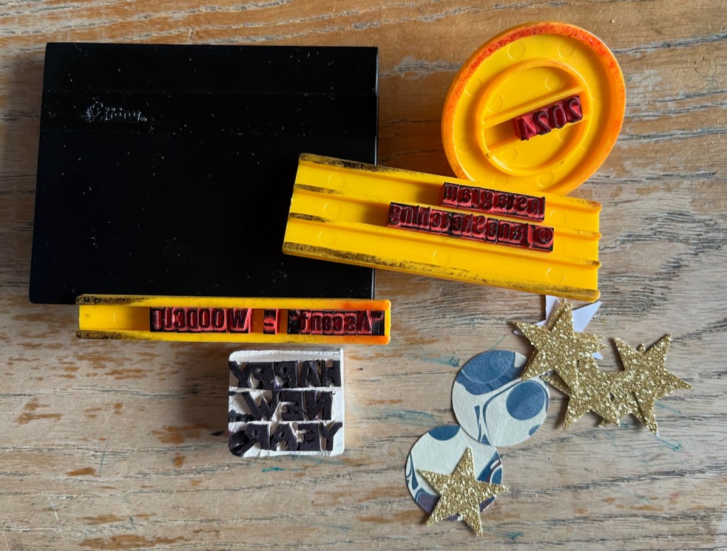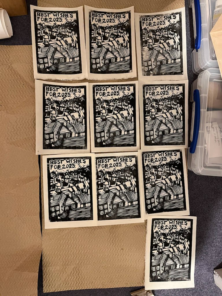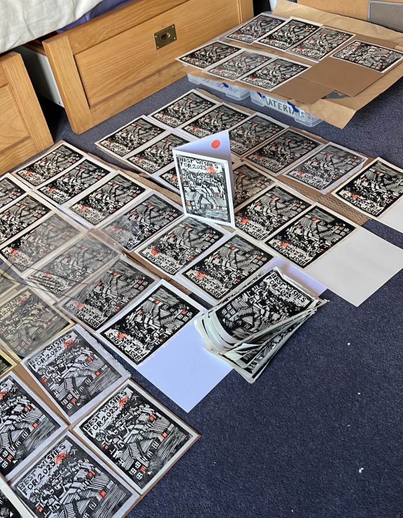 Technical information: The woodcut is on plywood, bought from “Great Art”on the Kingsland Road, not far from this sculpture. The ink is Schminke relief ink, applied with a roller. I printed the image by hand at my desk, using a roller and pressing the paper down with the convex side of a spoon. The paper is lightweight Thai Mulberry (45gsm) in various shades: sea grey, peppermint and natural, bought online from the “Perfect Paper Company”. The round “planets” are offcuts of marbled paper from the Wyvern Press. I cut the stars out of old sparkly wrapping paper, using a star cutter. The “Happy New Year” text is cut from a pencil eraser. Other text is from an old-fashioned printing outfit.