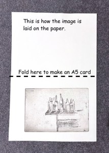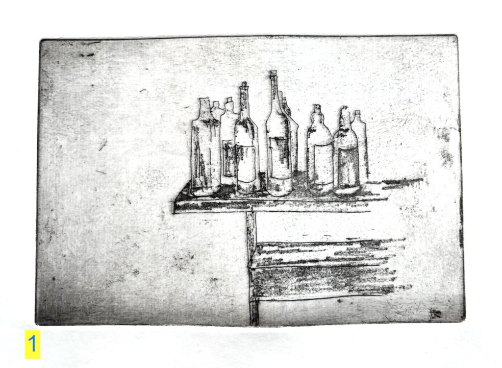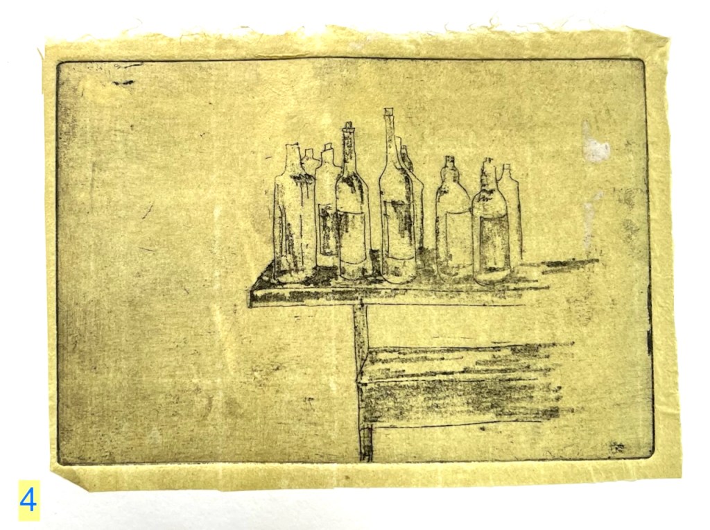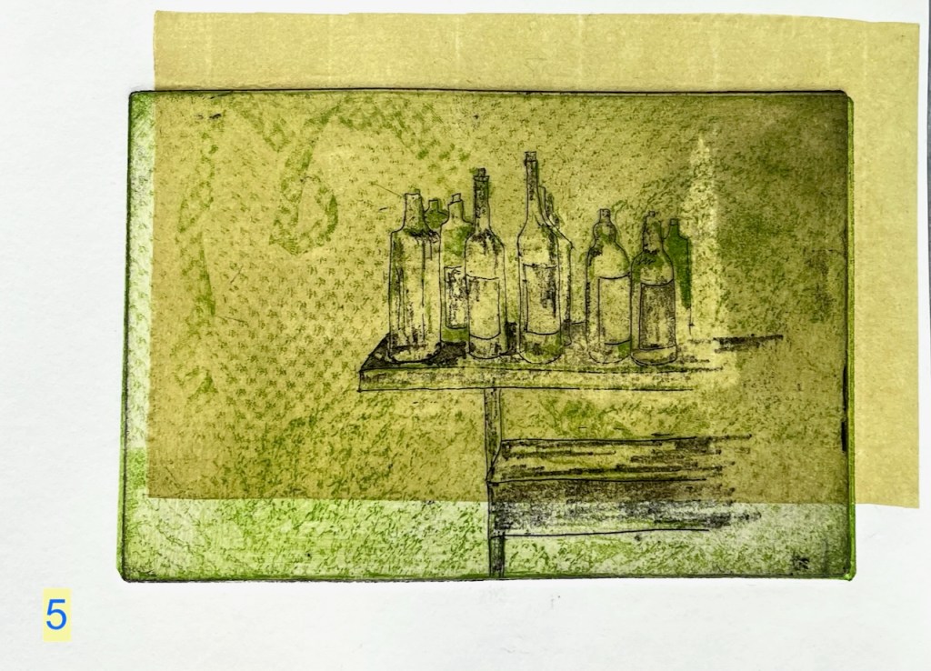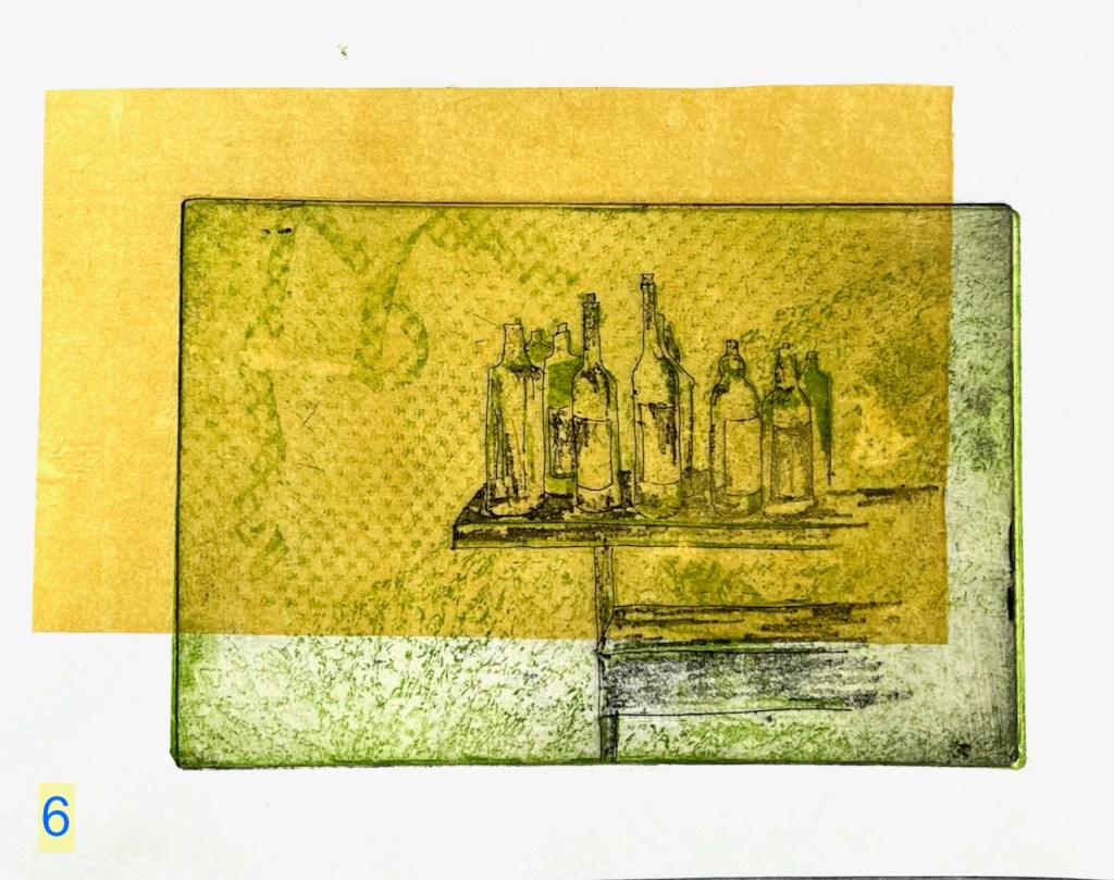 Chine collé is thin paper. I put it on the plate before the print roller goes over. The heavy rollers squeeze the coloured paper onto the picture, giving the yellow rectangles on the images of prints 5 and 6. The yellow rectangles give a sense of depth – maybe you are looking at these bottles through a window. Or maybe there is a window above casting a sunlit patch.