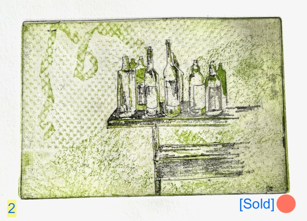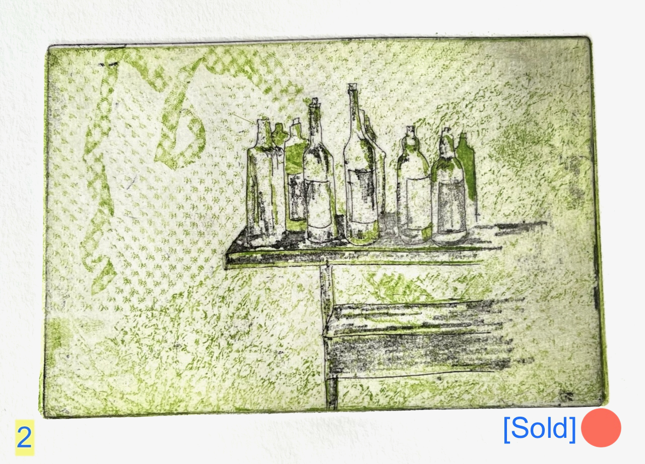 The ink is Intaglio Printmaker etching ink: Bone Black Shop Mix, and Light Green. Print 3 is made from two etched copper plates: first I printed the background pattern using green ink, then I printed the bottles and table, using black ink on another plate.