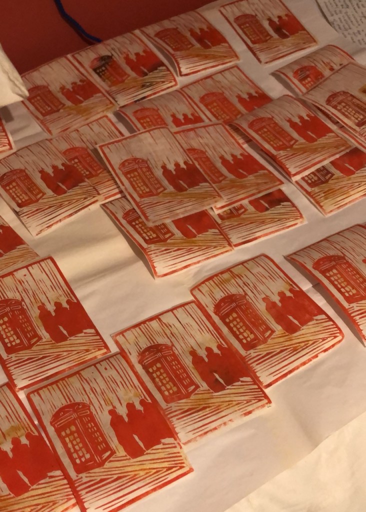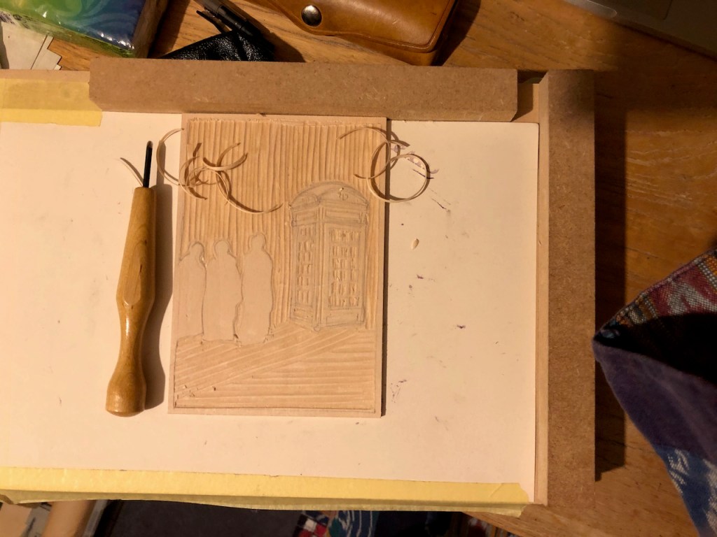 I based my woodcut on phone boxes I have encountered recently. It is a K2 phone box, like the one at Lower Marsh, Waterloo. You can tell, because it has six rows of windows.