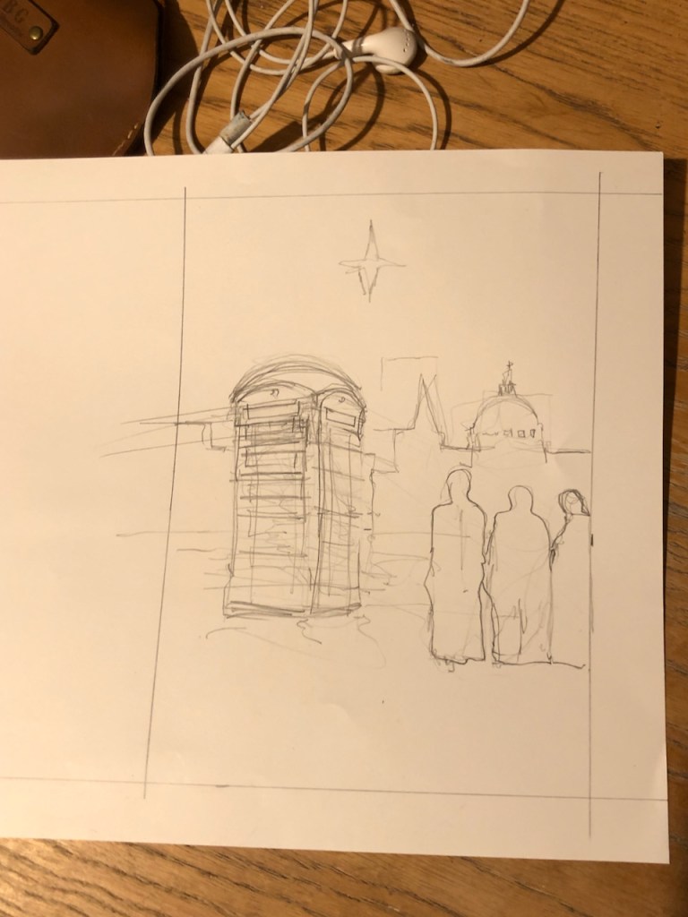 Also in the woodcut I put some people. These might be the three wise men, looking for hope and salvation in a humble building.