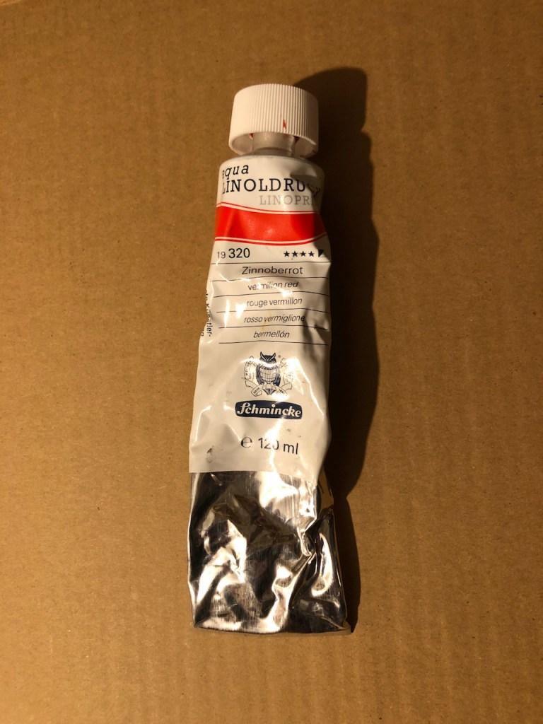 They are woodcuts, two plates. The orange/red colour was printed first. The black colour is the Schminke “Aquadruck” black relief ink diluted with extender kindly lent to me by Connie at East London Printmakers. Her extender was from the Caligo range, and was slightly whitish. It seemed to work better than the Schminke version.