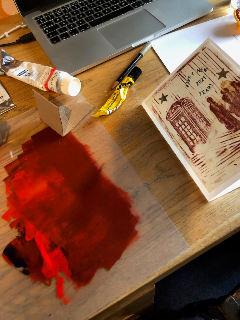 It’s a two-plate woodcut. I call the design “VICISSITUDES” because it shows the ups and downs of the year. The star and the sunrise are cut from a magazine, Vogue or the FT “How to Spend It” supplement, both of which contain high quality paper which cuts cleanly.