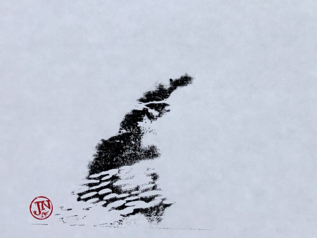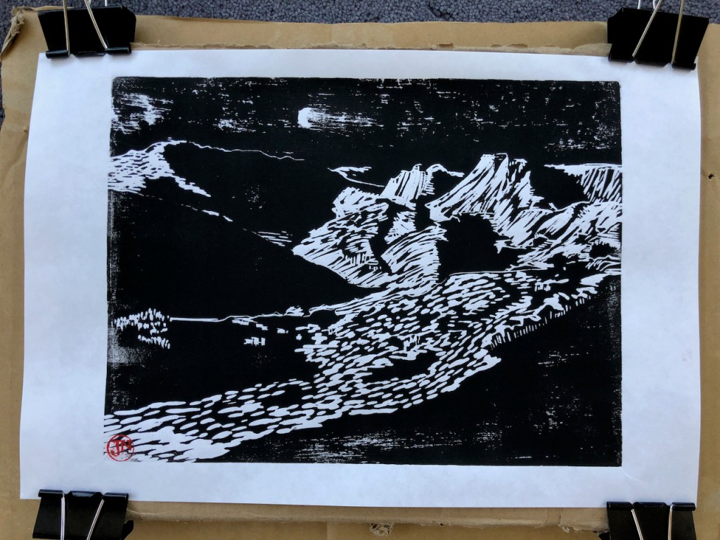 The wood is Japanese plywood, 12″ x 9″. The ink is Schmincke Aqua Linoldruck relief printing ink, ivory black. It can be cleaned off with water. The seal is a hand-carved stone seal made my friend and mentor in Japan, who also supplied the special red seal ink, and instructions for its use.