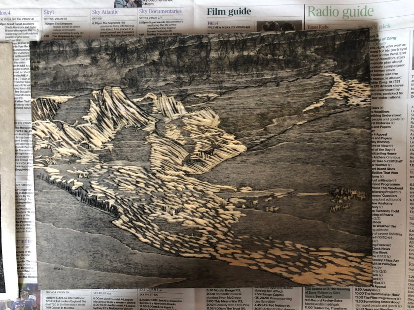 I made a woodcut of a valley in the Lake District in the moonlight. The hills on the skyline, right of centre, are the Langdale Pikes.