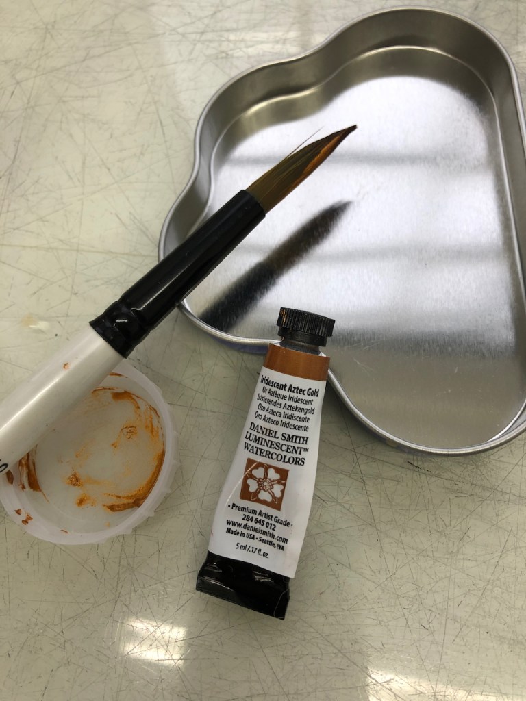 The background gold colour is, amazingly, watercolour: Daniel Smith Iridescent Gold. The red is Schmincke relief printing ink. The paper came, via friends, from “Paper Nao” in Tokyo. It is kozo paper, I think K-148, and brilliant for hand-printing. It doesn’t crinkle, it takes the colour well, and it’s really strong so it doesn’t tear when you pull it off the plate.