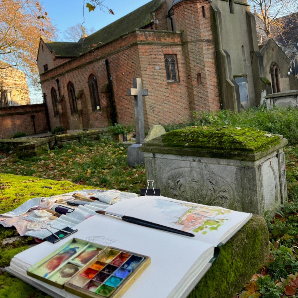 Old Church of St Mary, Stoke Newington, London N10 sketched 1 December 2023 in Sketchbook 13