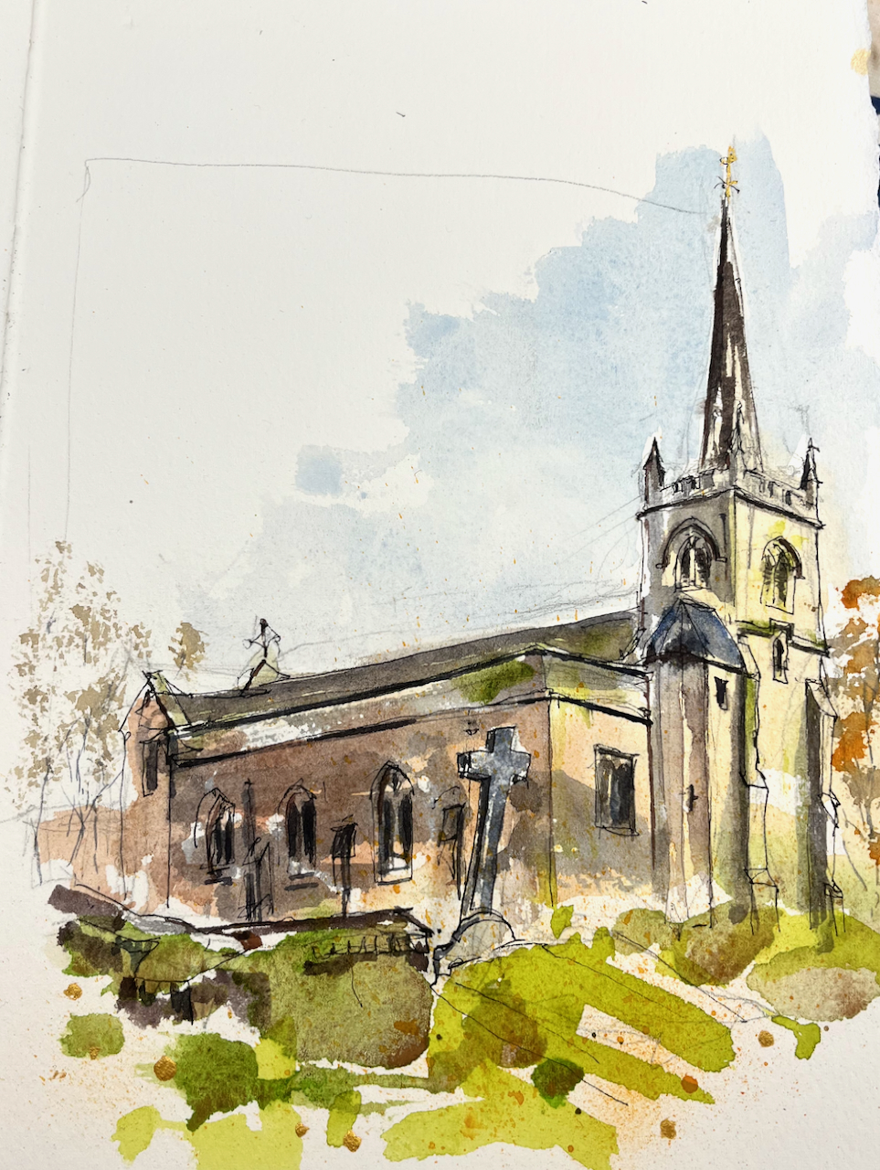 I sketched the church quickly as it was 2 degrees C outdoors. Then I caught the number 73 bus back down the hill to central London. Here is work in progress on the sketch.