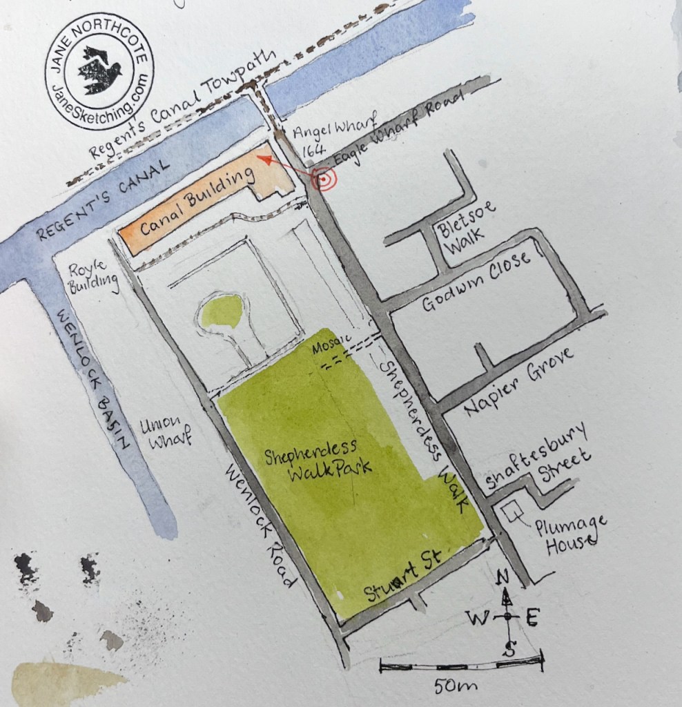The building overhanging, in the top right of the drawing is part of Angel Wharf, 164 Shepherdess Walk. Shepherdess Walk leads over the Regents Canal, the bridge is just behind the cars in the picture. The buildings you see above the cars are on the other sidee of the canal. On the left is the “Wenlock Brewery”.