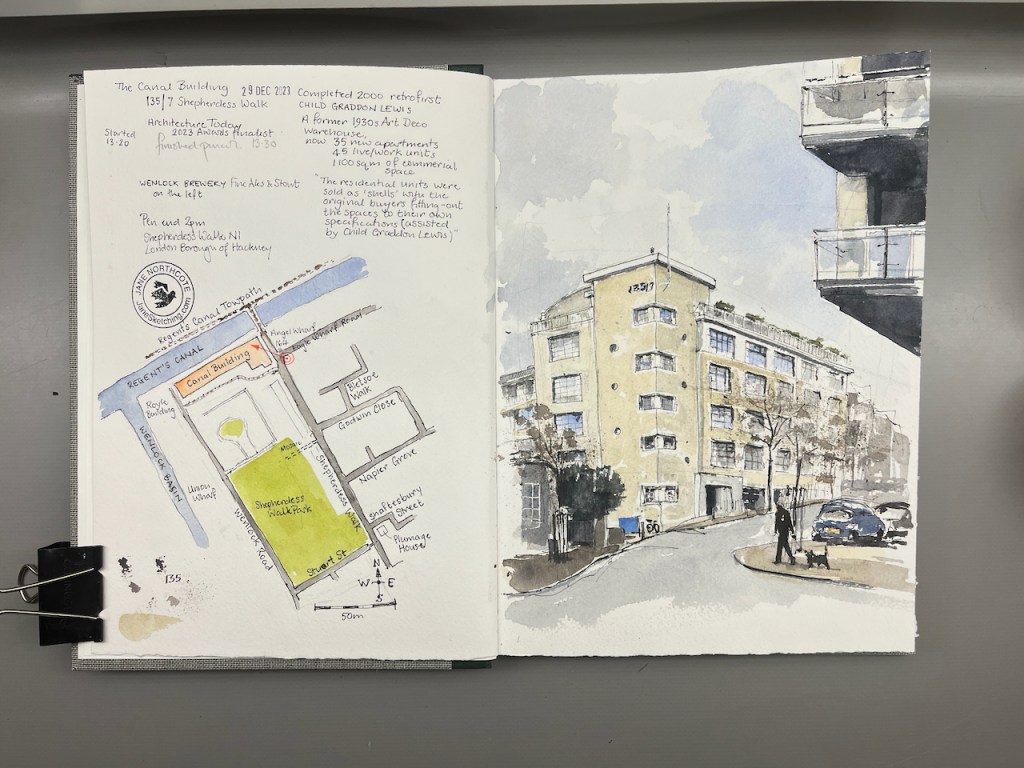 Canal Building, Shepherdess Walk, London N1, sketched 29 December 2023 in Sketchbook 14