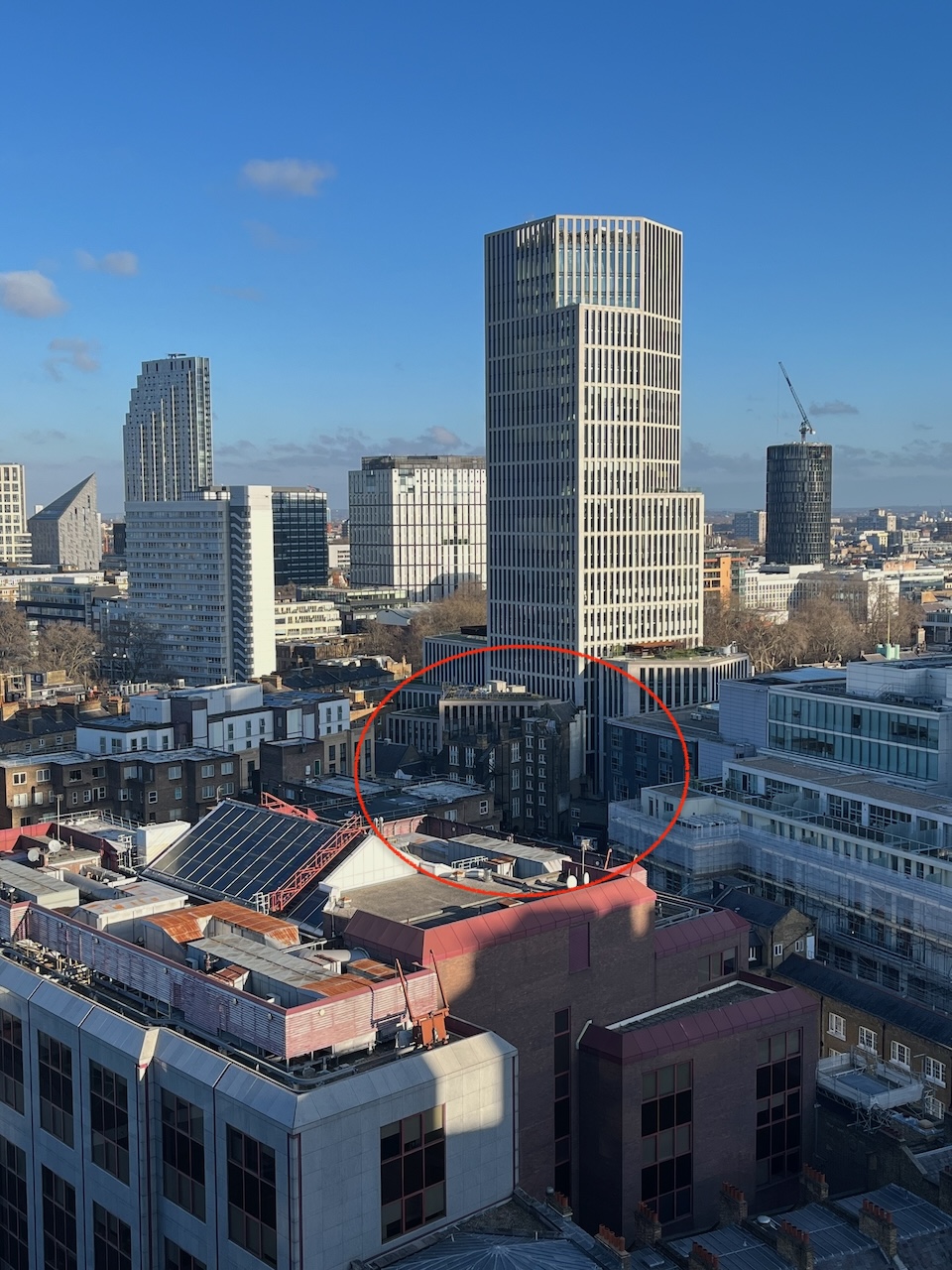 21 Moorfields, from the Barbican Highwalk under Willoughby House.