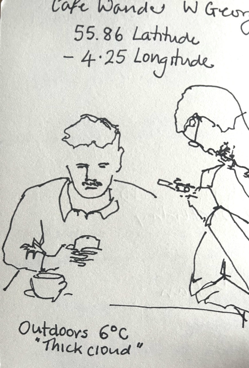 Walking out of the bus station, and wandering at random through the grid of streets, I spotted the “Café Wander” in a basement. This is at 110 West George St and was a great find: welcoming people, a big mug of tea, food, and a charging point for my phone. No rush, I could think and sketch, and feel as though I’d arrived. I decided to head for the river. A river tells you about a city.