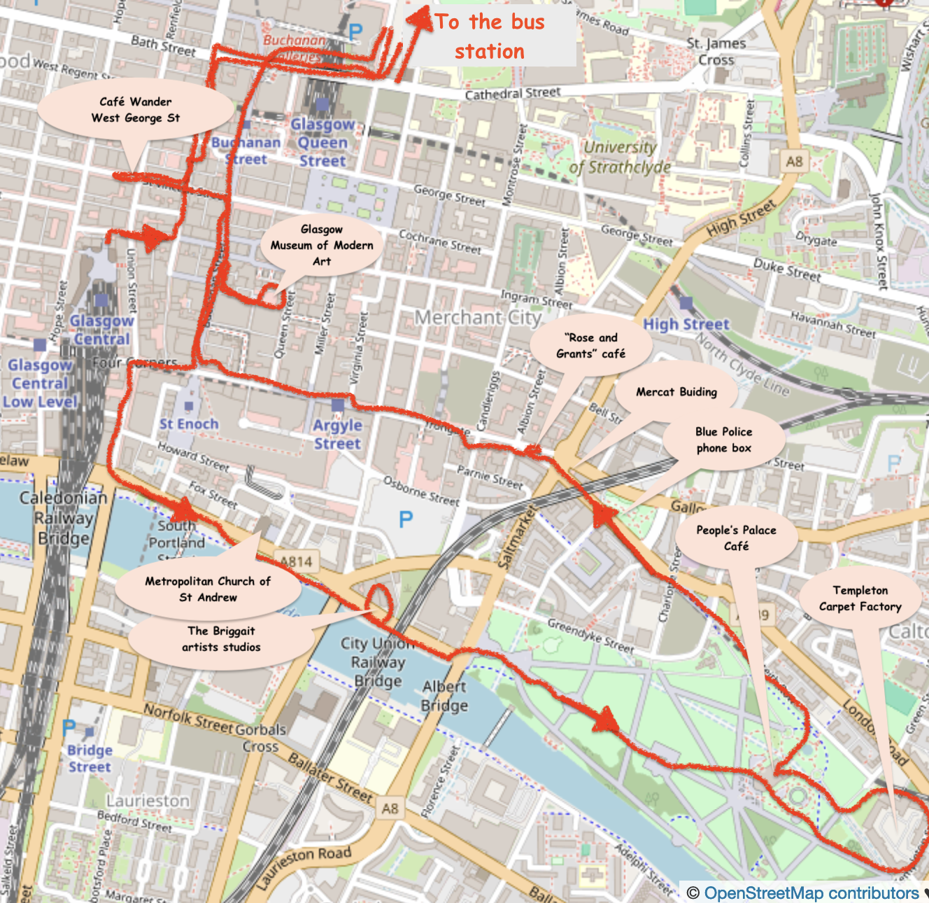 My wanderings around Glasgow. Positions of monuments and cafés are approximate. Map (c) Open Street Map Contributors.