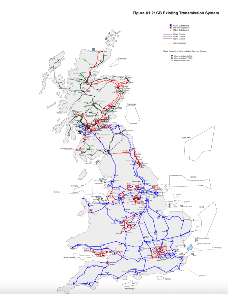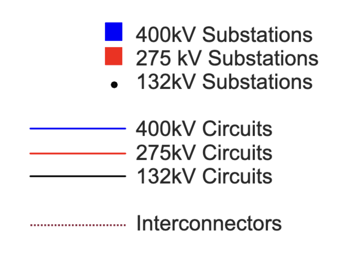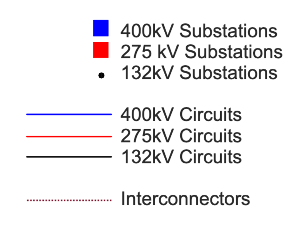 These diagrams come from a National Grid document on this link. The document is “Electricity Ten Year Statement 2012, Appendix A1”. It’s over 12 years old so there may be different connections now.