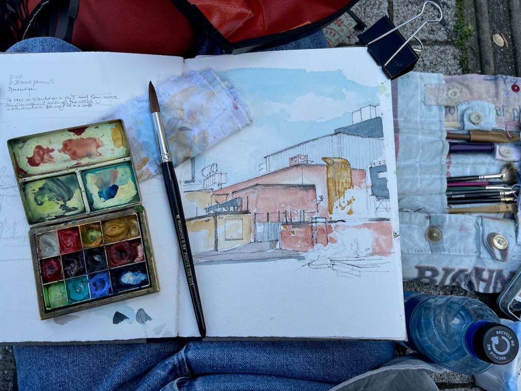 I did the pen on location and added the colour at my desk later. It was cold outside and I was sitting on a damp stone wall. Many people were out and about in the area, and two of them stopped to say hello and look at the drawing.