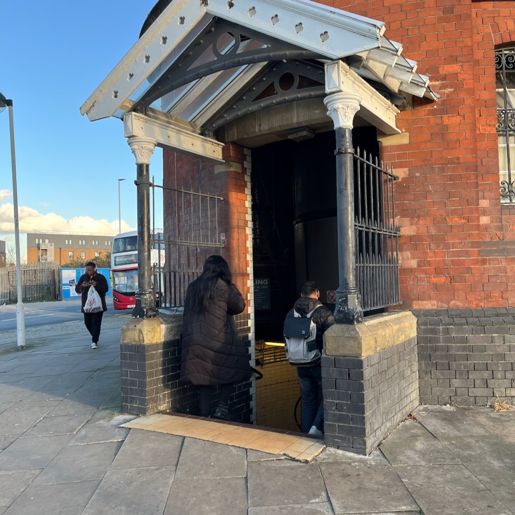 North entrance to the foot tunnel. The Superloop bus from Walthamstow is in the background.