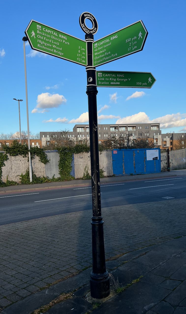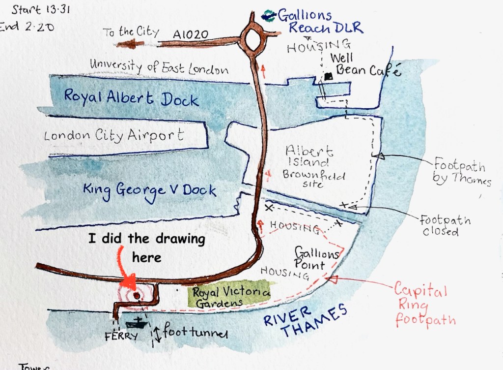 The signpost on the left of my drawing indicates the long distance footpath “The Capital Ring”. I followed this route along the Thames a little way. The path is cut off after the Galleons Point Housing development. Signs say that the lock gates are being maintained. So the route returns to the main road and passes over the spectacular bridges across the docks.