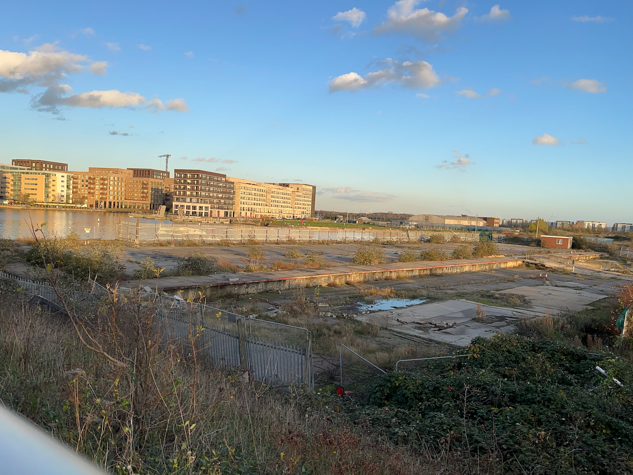The other direction from the airport, looking toward the Thames, is a scene which seems to define what we mean by “brown field site”.