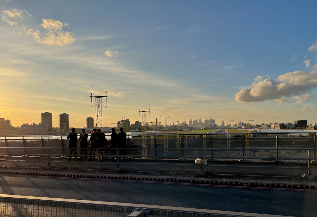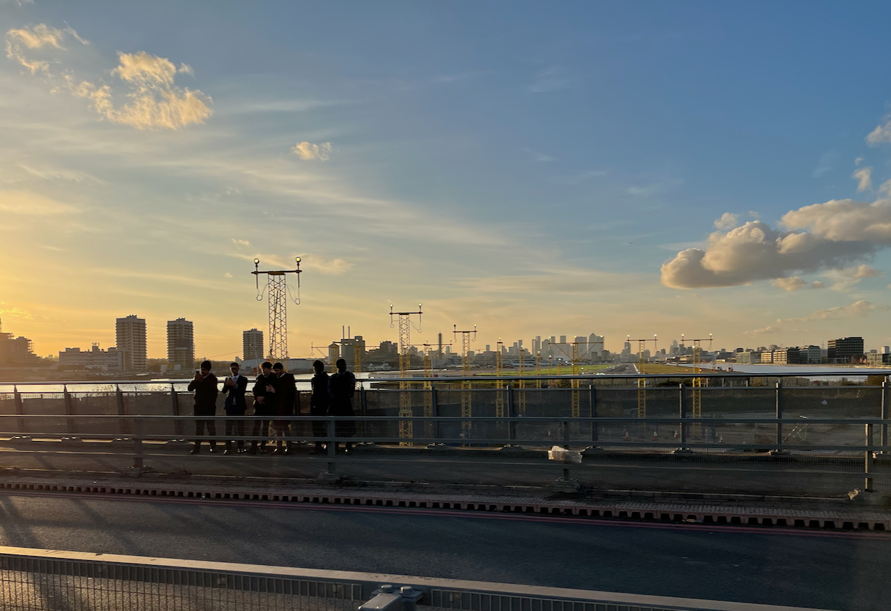 Plane spotters on the bridge over the Royal Albert Dock. City of London in the distance.