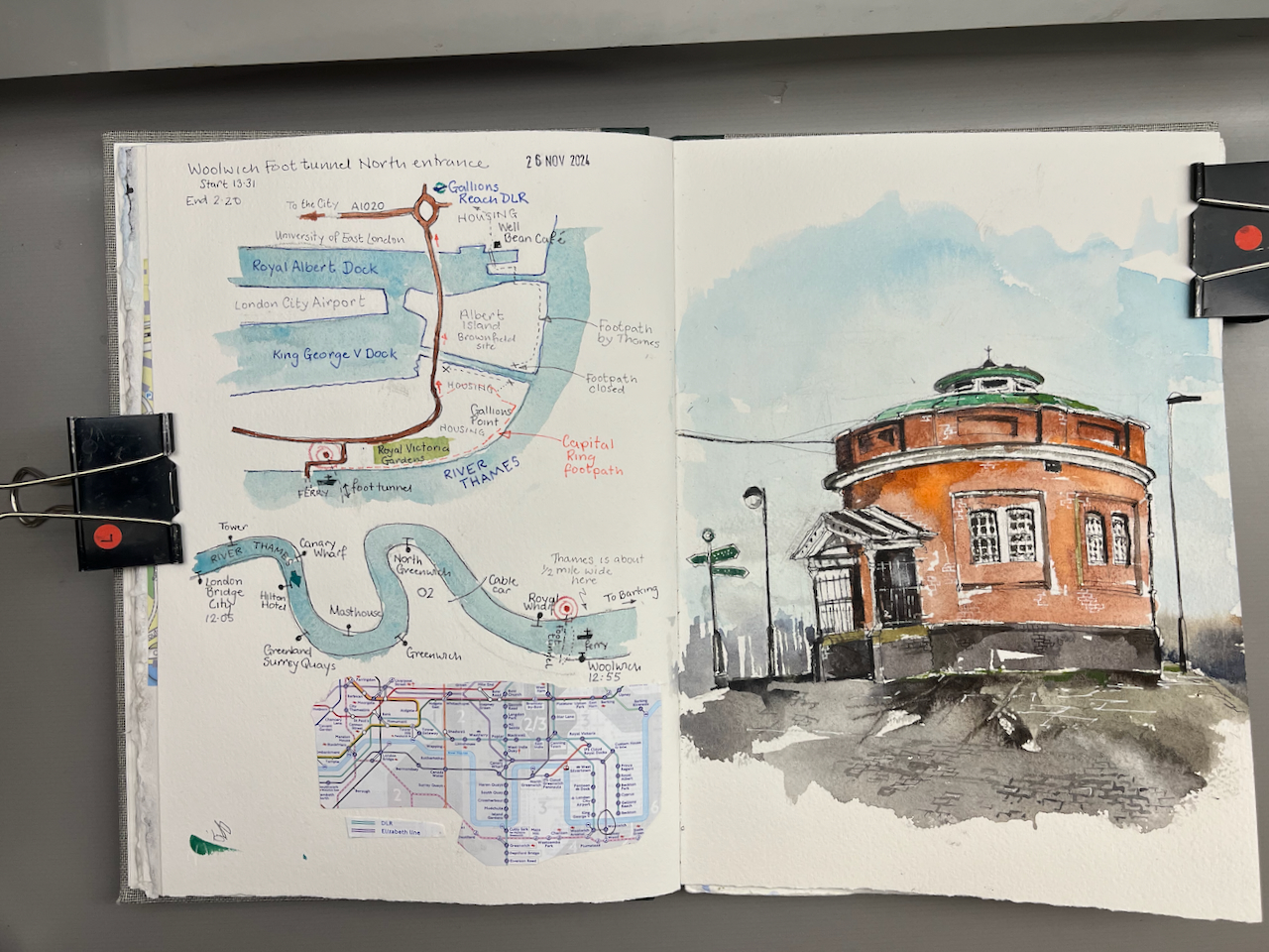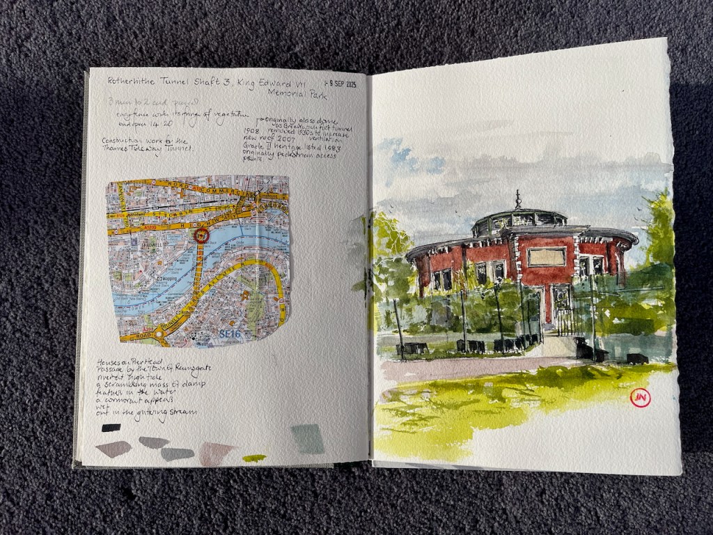 Rotherhithe Tunnel Shaft 3, King Edward VII Memorial Park, sketched 9th September 2025 in Sketchbook 16