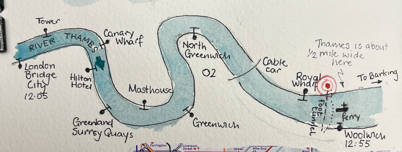 You can see one shaft from the other. Here’s a picture looking North across the Thames, just before I started the sketch. The light wasn’t great, but you can still see both shafts 2 and 3. See how wide the river is at this point! The distance between the two shafts is around 1500ft (500 metres).