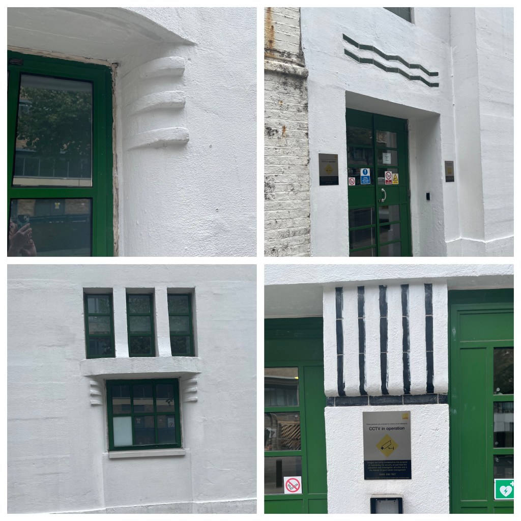 This was built of re-inforced concrete in 1931, to the designs of architects Wallis, Gilbert and Partners. The style is called “Streamline Moderne” and includes fun details.