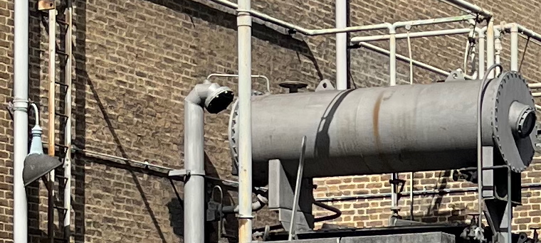 There were many more pipes and connectors than I could fit into the drawing. They all looked important. This is a serious building. The sign on the wall says “Danger of Death”. But the pipework has a certain lighthearted steampunk appeal. The arrangement has lamps, ladders and valves in odd places, and inexplicable vents, as though it might huff and exude puffs of steam. But when I saw it, the whole structure was silent and still.