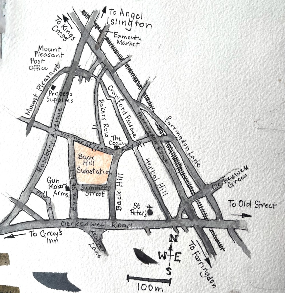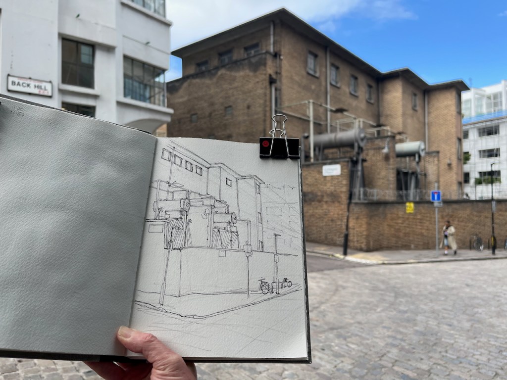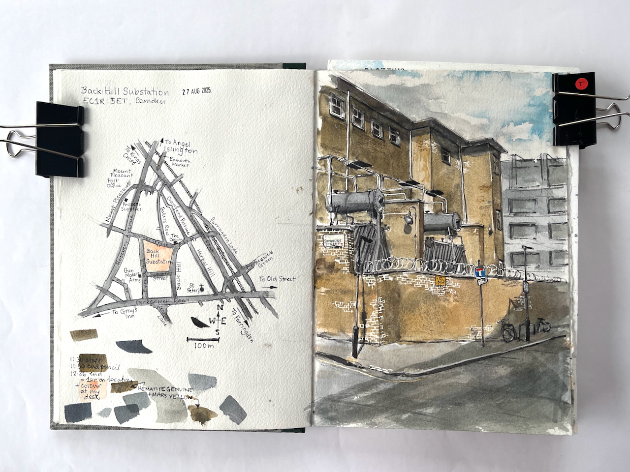 Back Hill substation, EC1R 5ET, sketched 27 August 2025 in Sketchbook 16