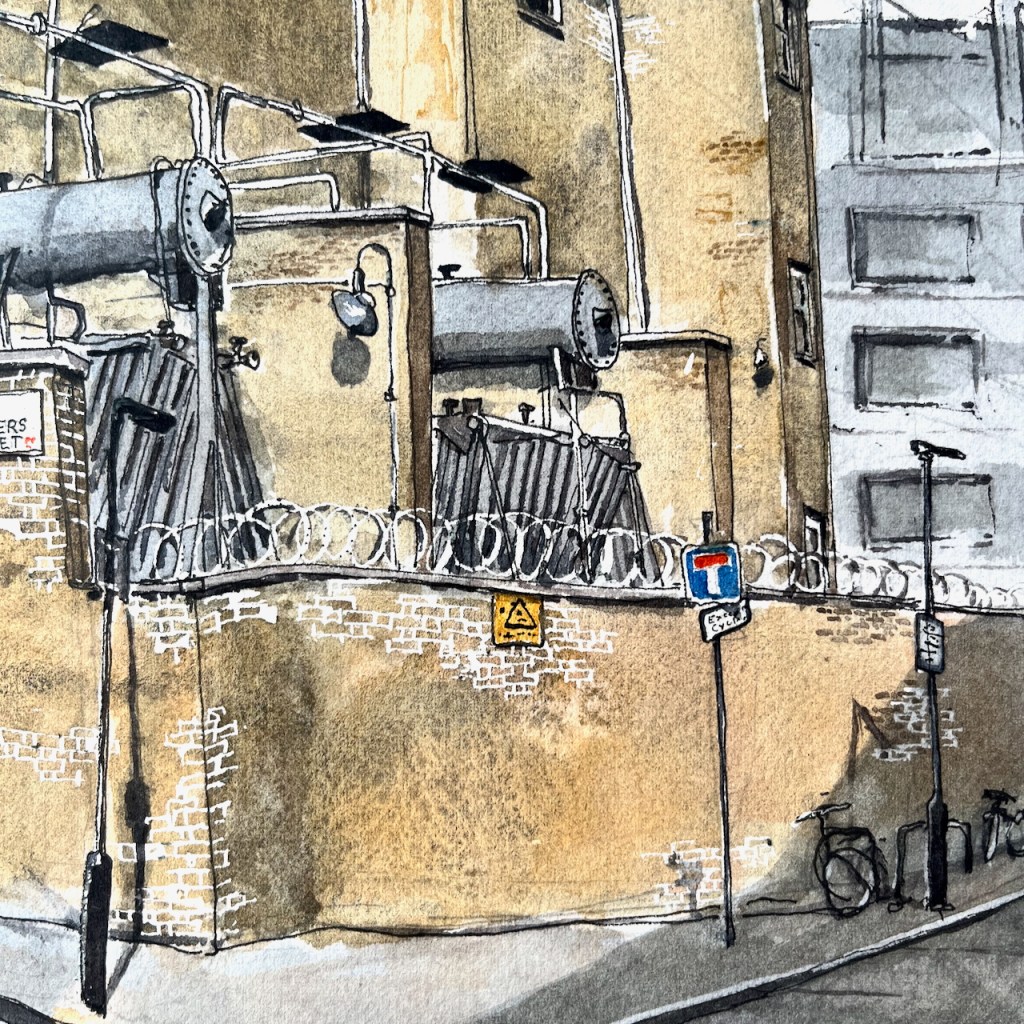 This imposing building presides over an entire block, in the back-streets of Camden. I’ve admired its austerity and unadorned walls, amongst the much more elaborate buildings around. This is an electricity substation, very functional. I’d noticed it while sketching The Coach, a nearby pub.