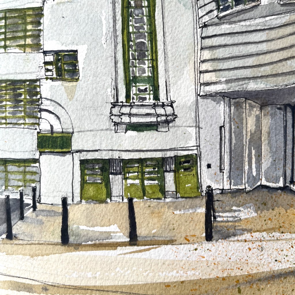 This building with its curves was tricky to draw and took me a long time. The person who had approached me to describe the history returned back up the street. She held out a hand containing fresh hazel nuts she had collected from the pavement. “I don’t think Camden Council realise they have planted hazelnut trees” she said.