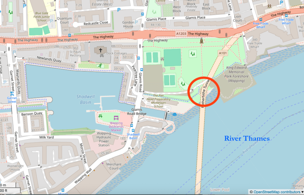 Map showing the Rotherhithe tunnel, all 4 shafts, and the entrances. Click to enlarge. (c) OpenStreetMapcontributors