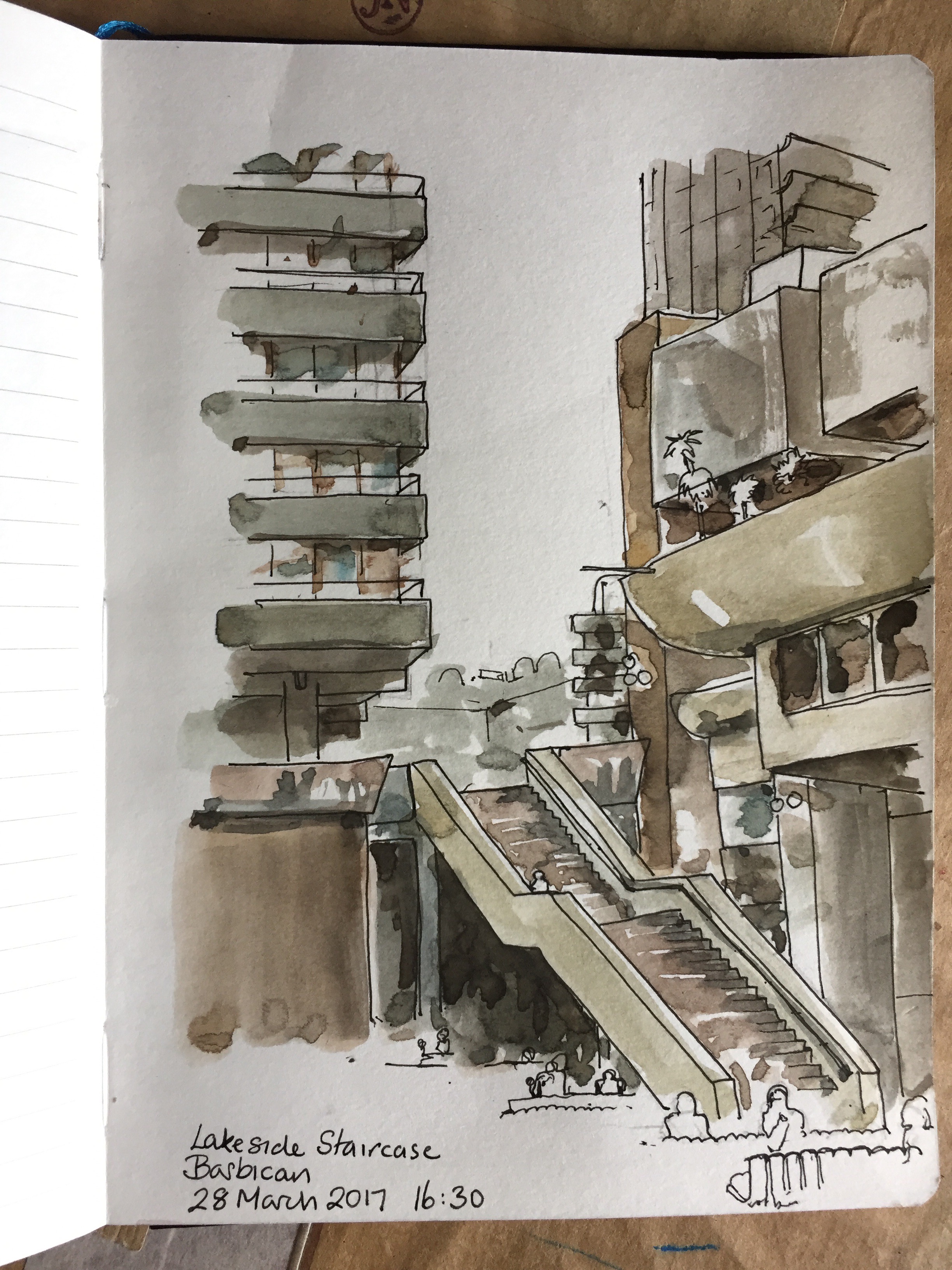 The shorter tower at the back on the right is Canaletto, which must be one of the hardest towers in London to draw. Those weird curved structures defeat my sense of perspective. Perhaps that’s the idea.