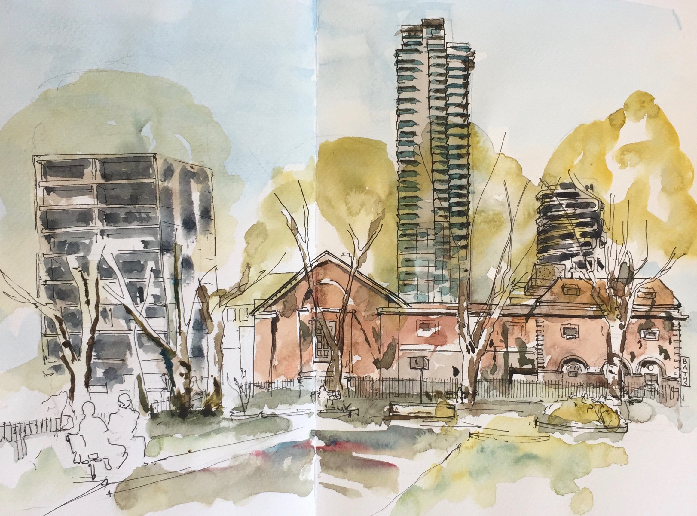 The building on the left of the picture is Burnhill House, run by Keniston Housing Association. Residents here are running a campaign to try to moderate plans to redevelop Finsbury leisure centre, which is off to the left of my drawing, and in front their building. Their banners adorn their balconies.