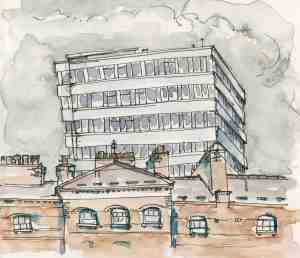 Finsbury Tower on Bunhill Row above Peabody Estate buildings. Finsbury Tower was a 1960s office building now undergoing extensive renovation. According to the planning application, the renovation will add 12 storeys to the existing 16, doubling the building’s height.