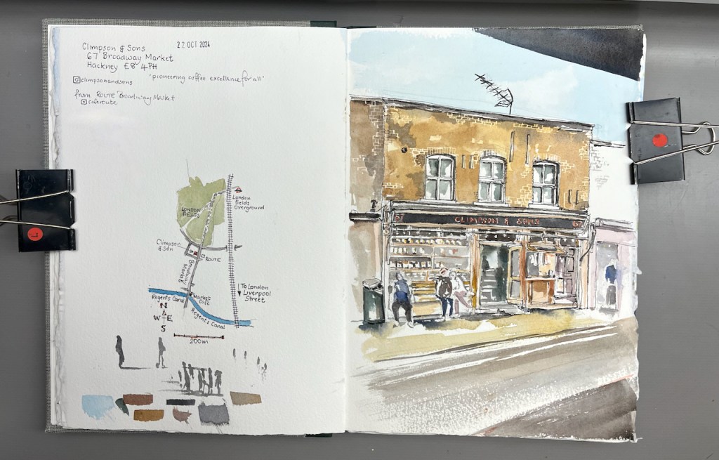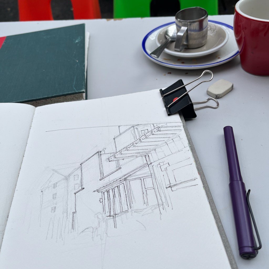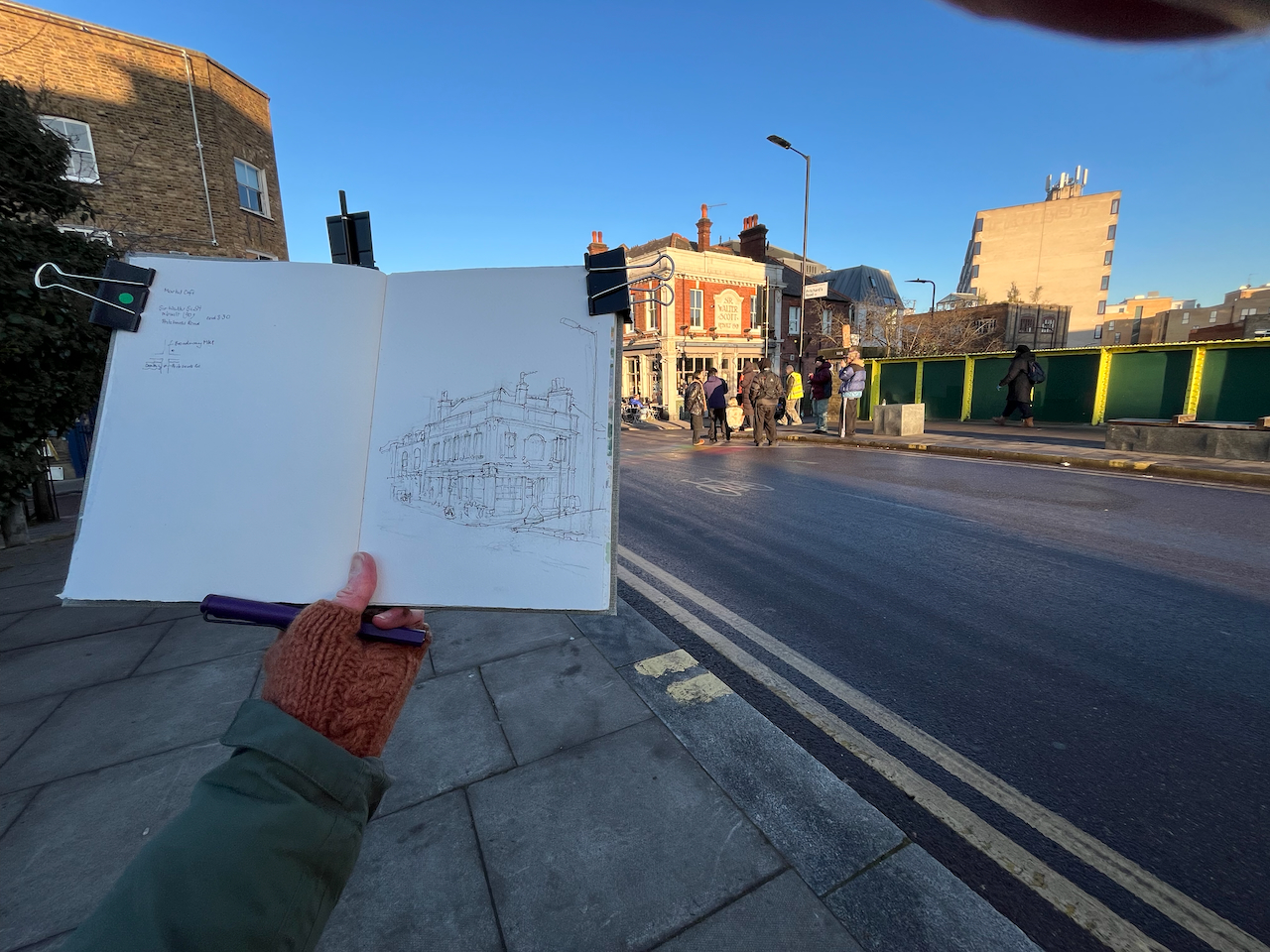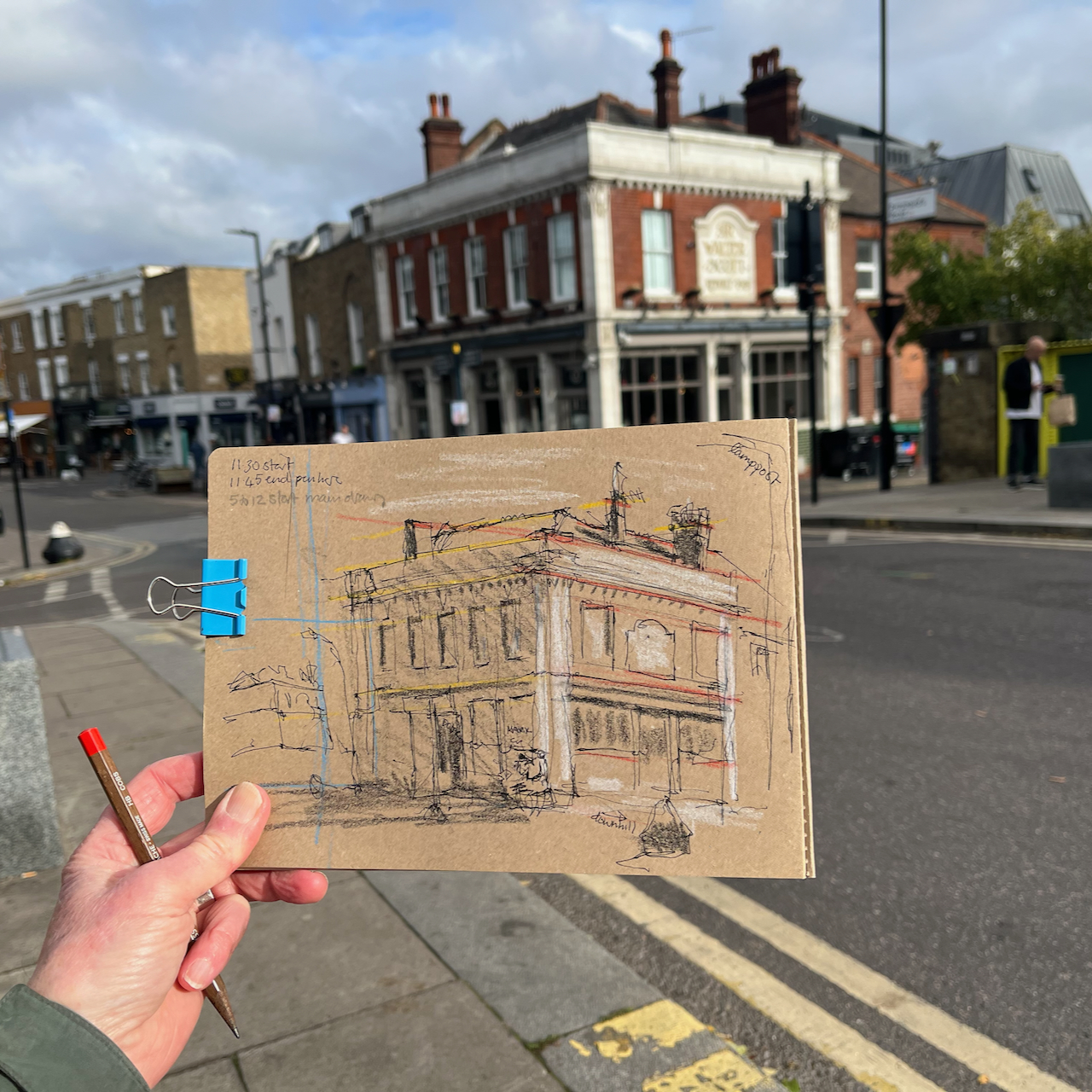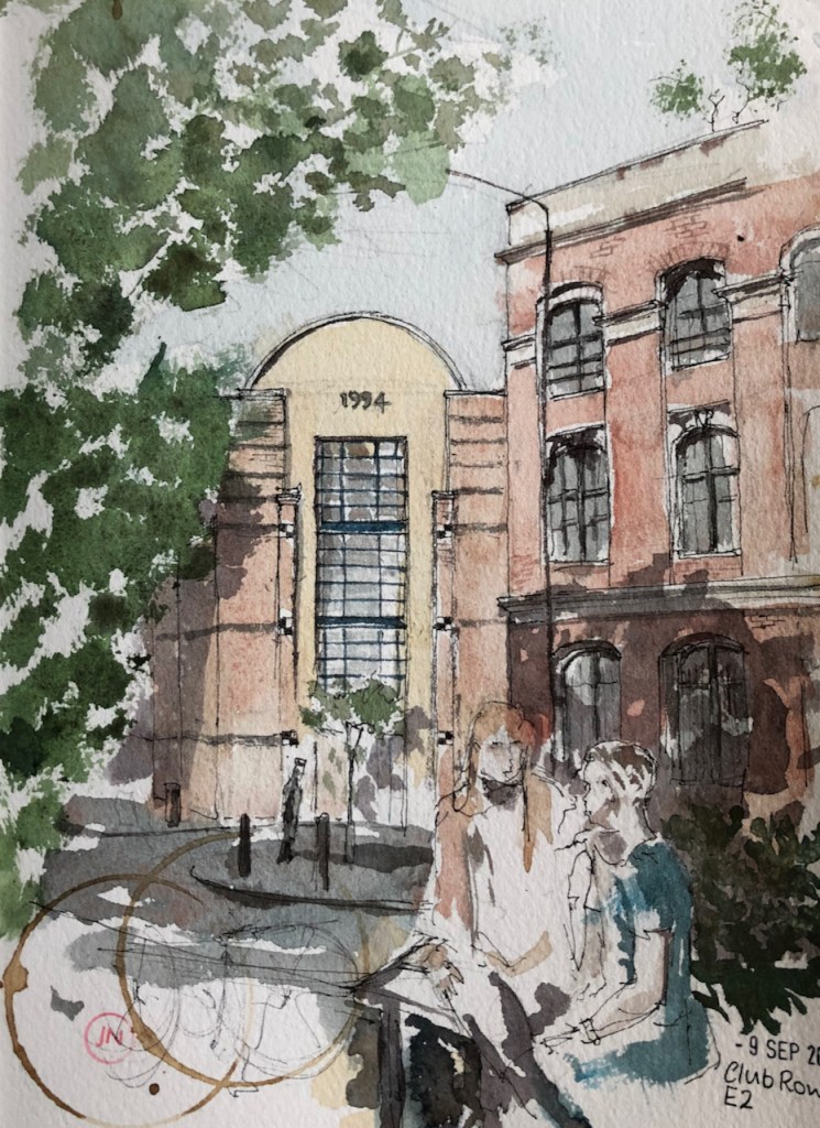 “The Leather Market” is one of a collection of co-working spaces managed by Workspace Group plc. We sketched and drank our coffee in the calm yard. Workers passed by and made encouraging comments.