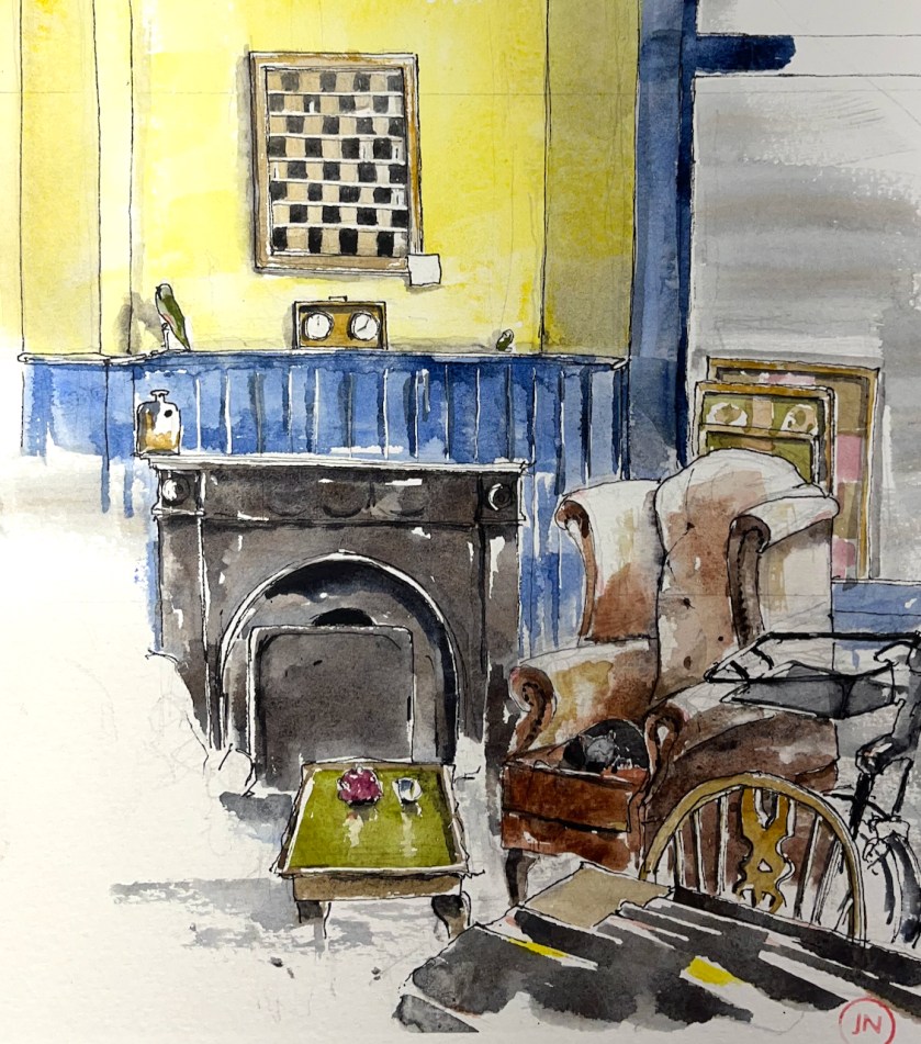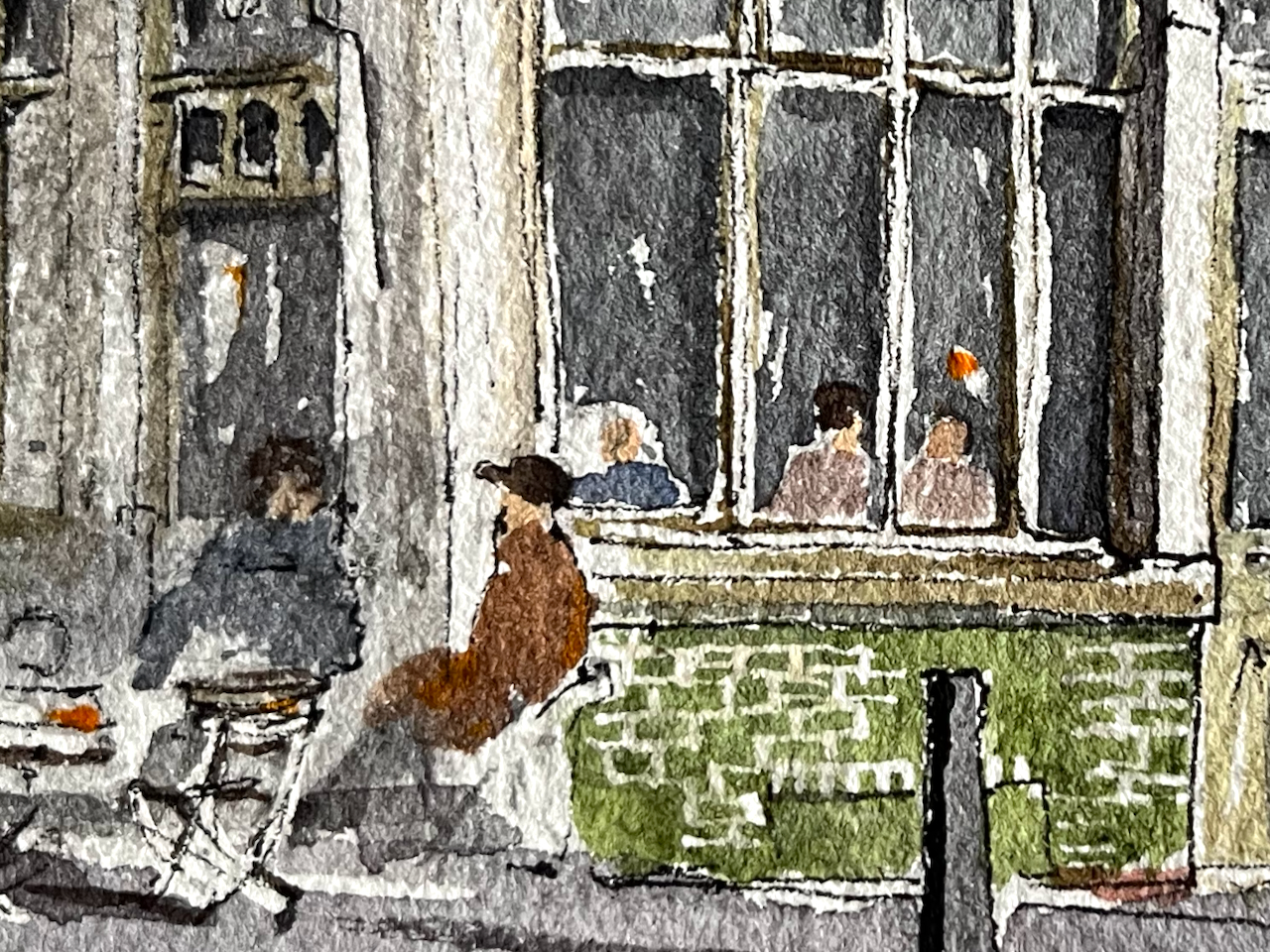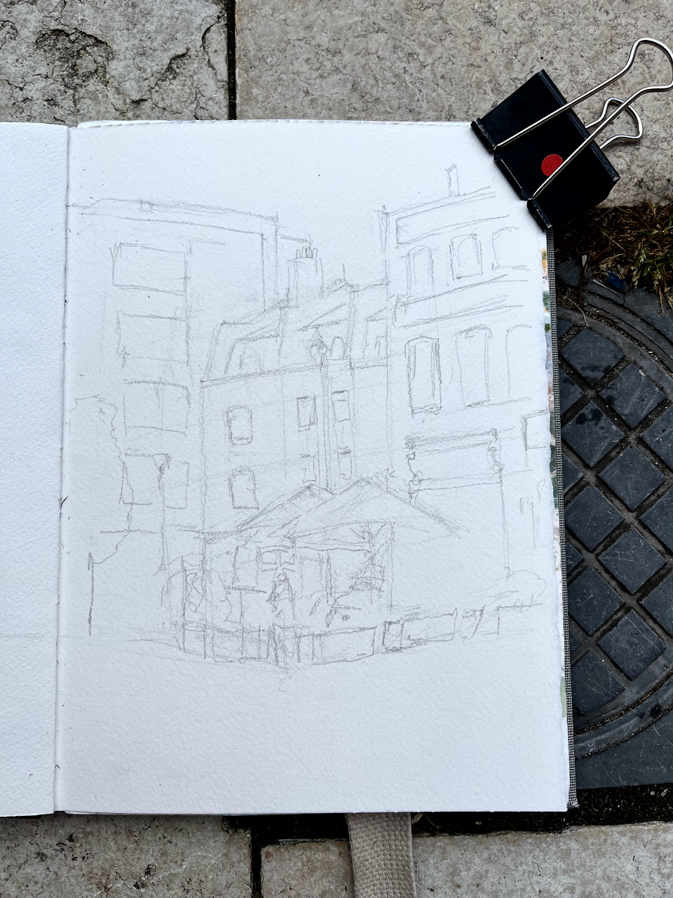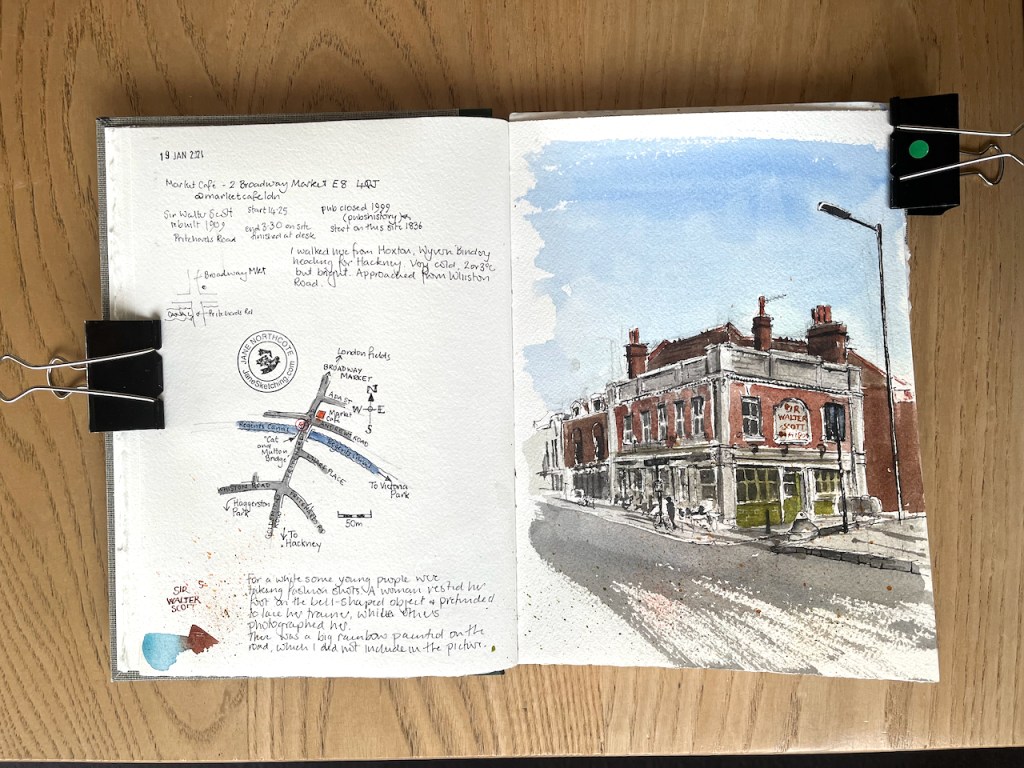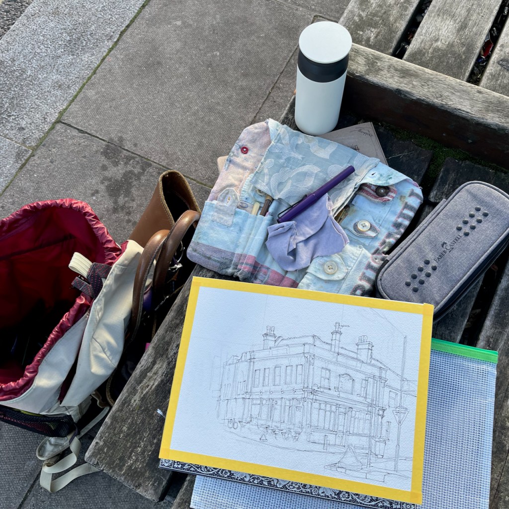 My pen is a Lamy Safari with EF nib, and De Atramentis Document Black waterproof ink. Paper is Arches Aquarelle 300gsm CP, in a book made by Wyvern Bindery of Hoxton