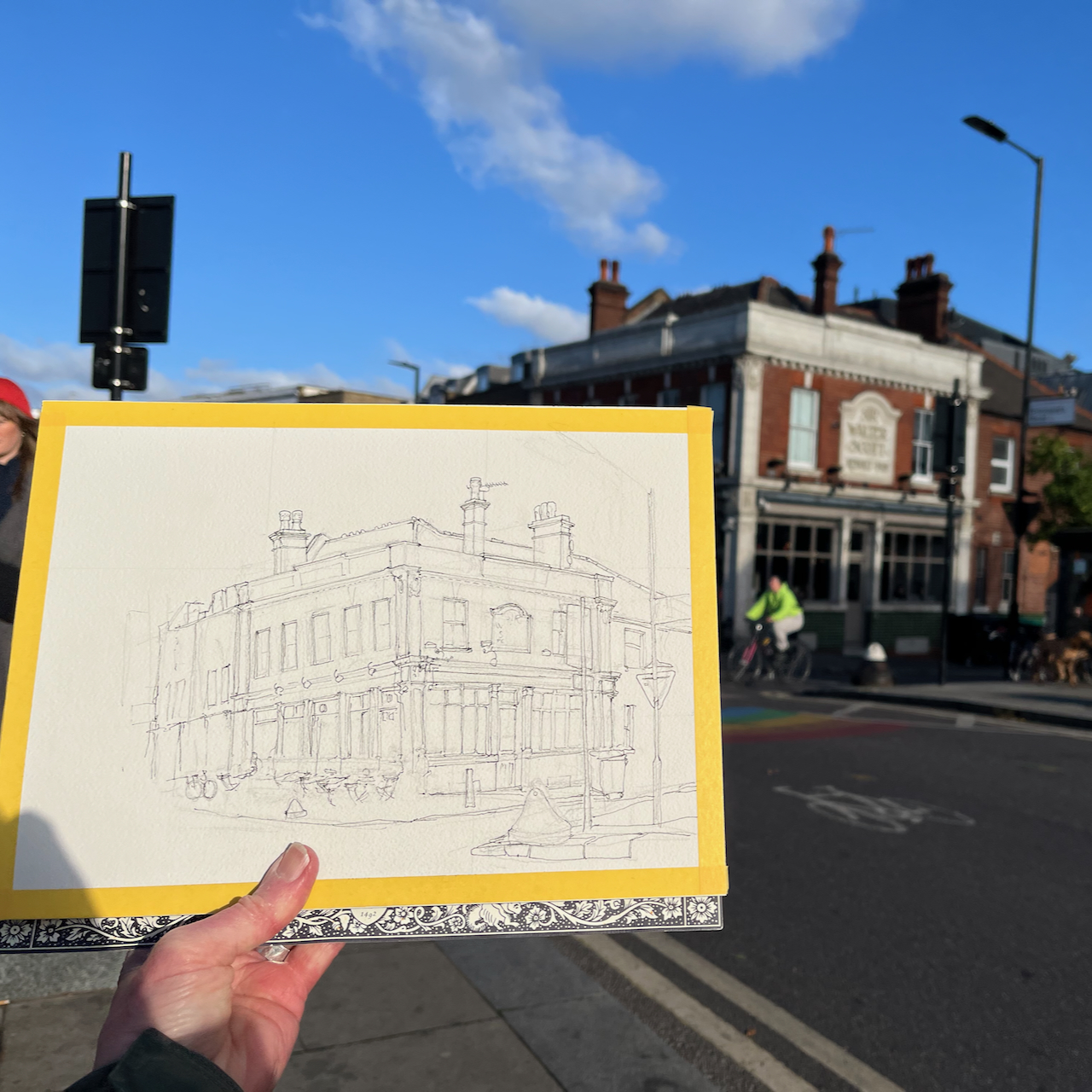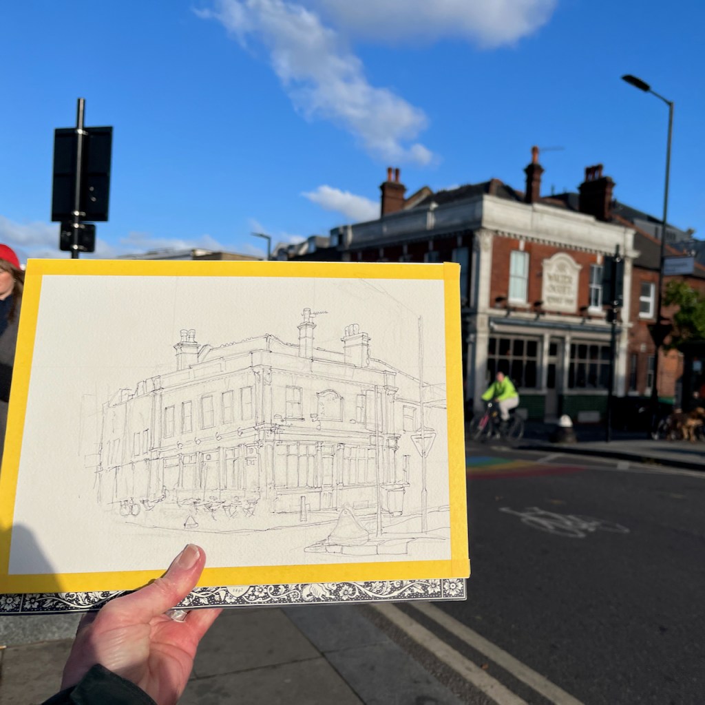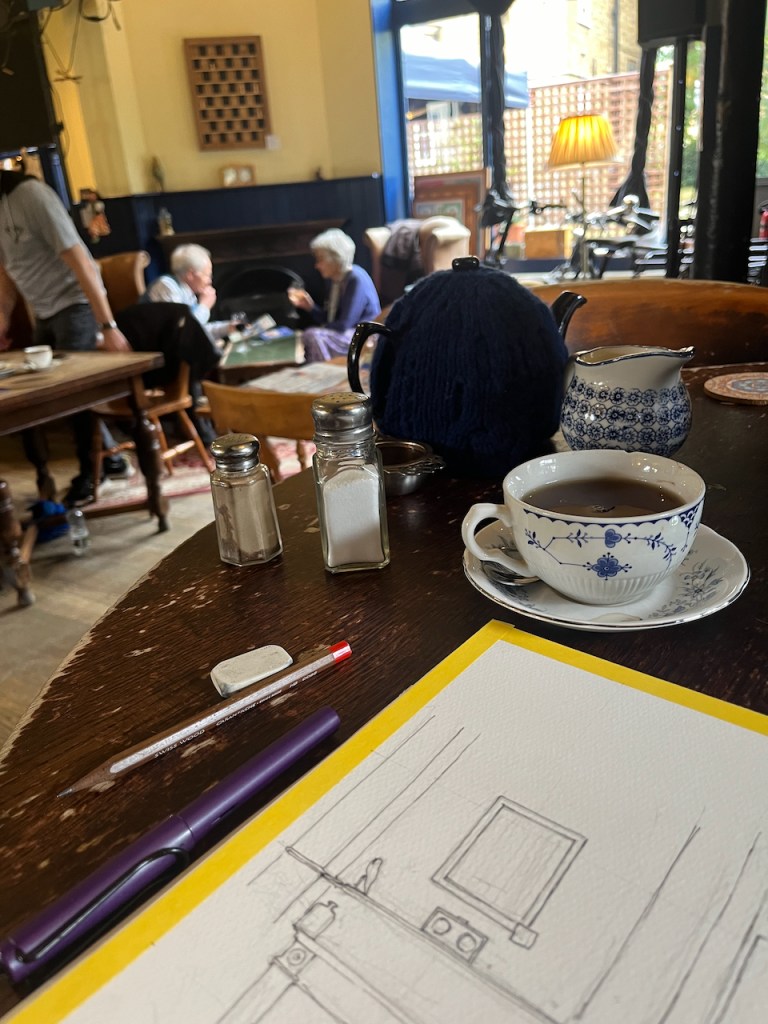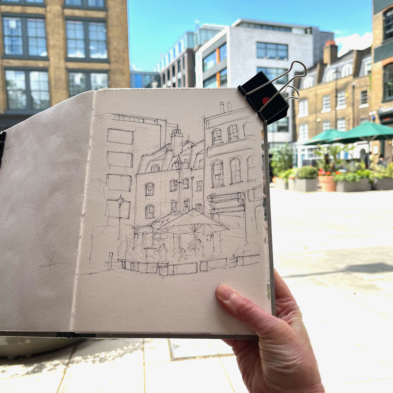 Toby, it turns out, is in charge of a café. He was standing on the pavement next to a huge arch by the Victorian frontage. Come in! he suggested. Lynn and I followed him through the arch. The space opened out into a large yard, with seats. Toby went into his café and we walked around the yard, sizing up the artistic possibilities. Lynn uttered a shriek of delight. She had discovered a point at the edge of the courtyard with an unexpected view of The Shard. And trees. This was her quest. She settled down to sketch while I went to procure coffee from Toby and his team. Then I started sketching too.