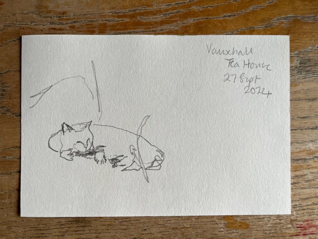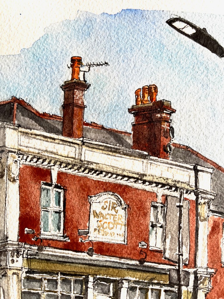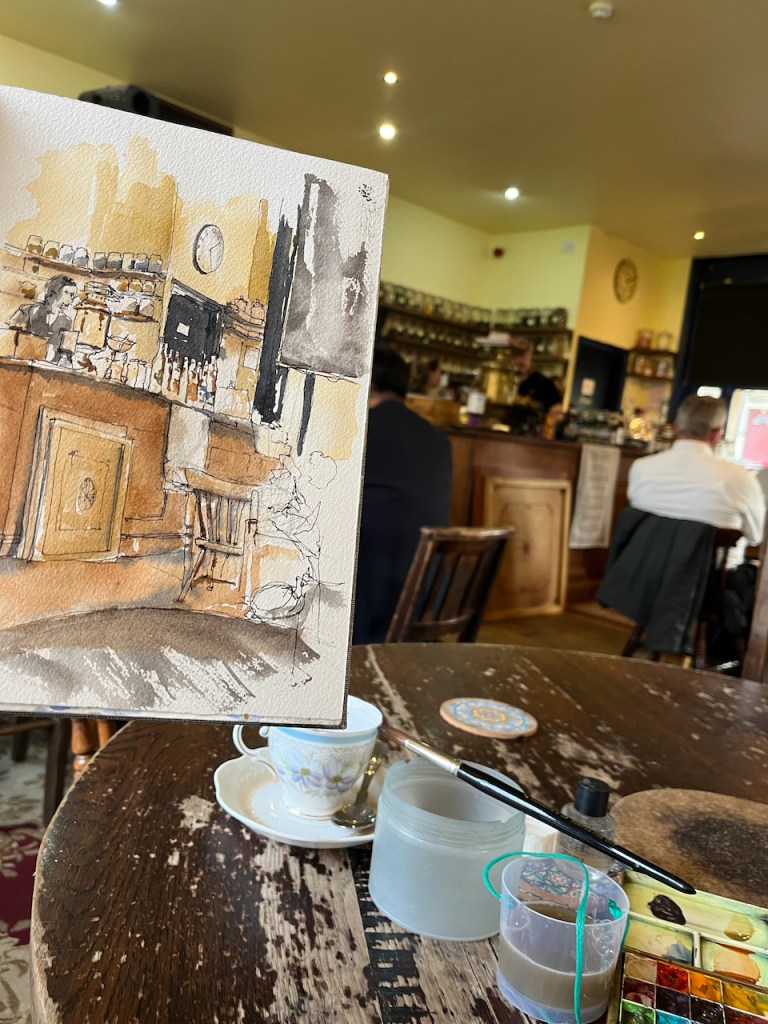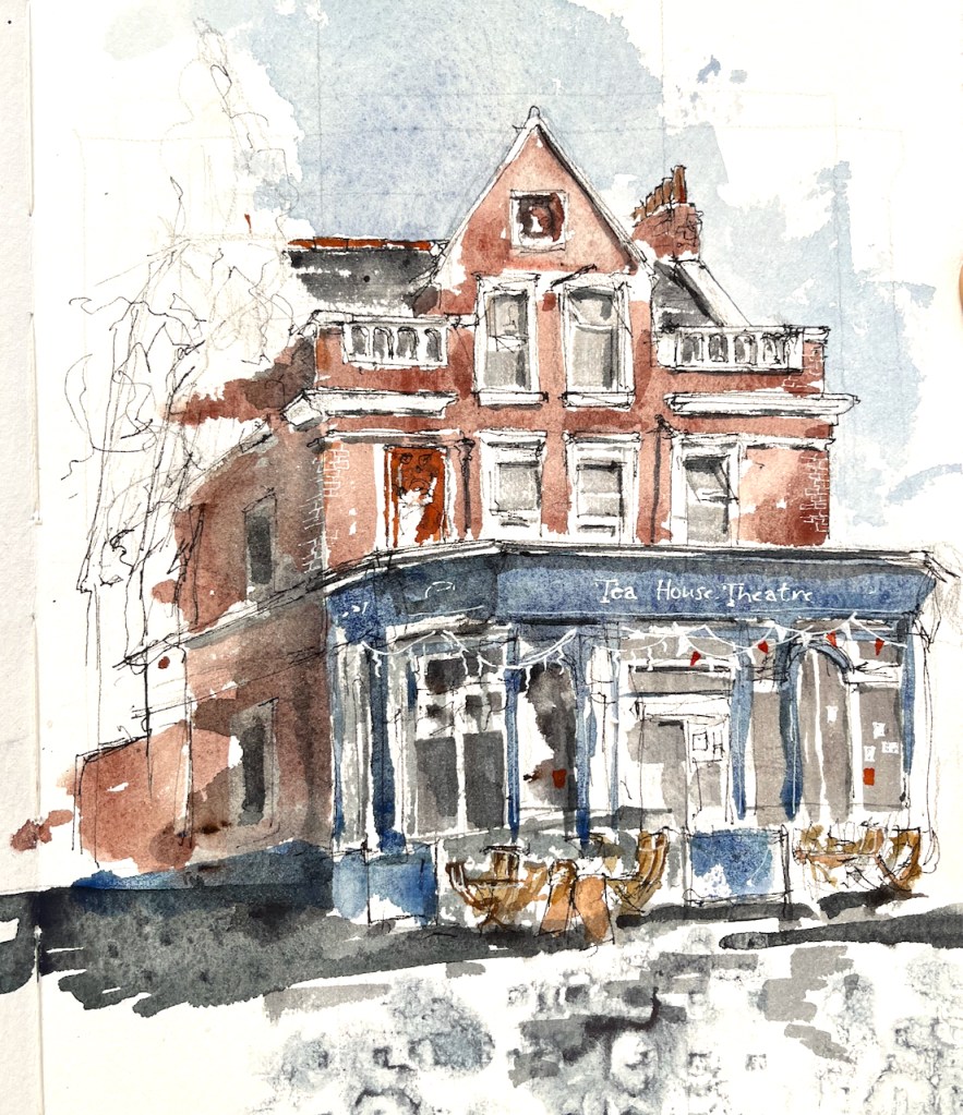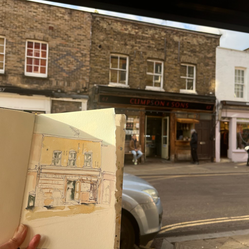 Toby, it turns out, is in charge of a café. He was standing on the pavement next to a huge arch by the Victorian frontage. Come in! he suggested. Lynn and I followed him through the arch. The space opened out into a large yard, with seats. Toby went into his café and we walked around the yard, sizing up the artistic possibilities. Lynn uttered a shriek of delight. She had discovered a point at the edge of the courtyard with an unexpected view of The Shard. And trees. This was her quest. She settled down to sketch while I went to procure coffee from Toby and his team. Then I started sketching too.