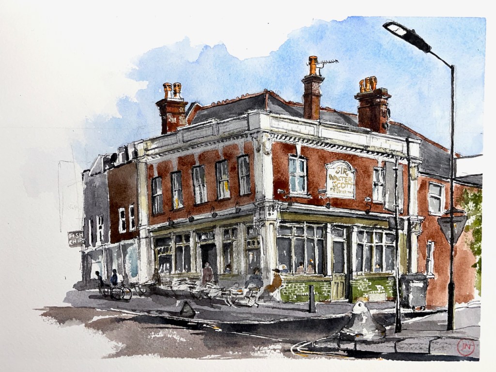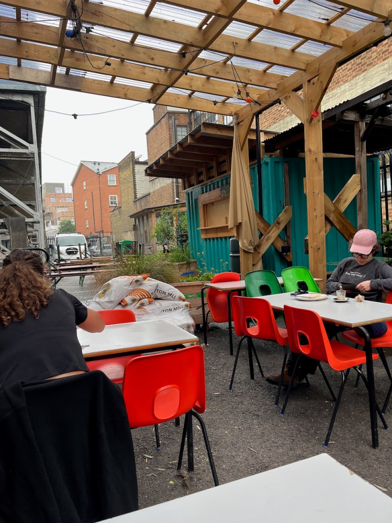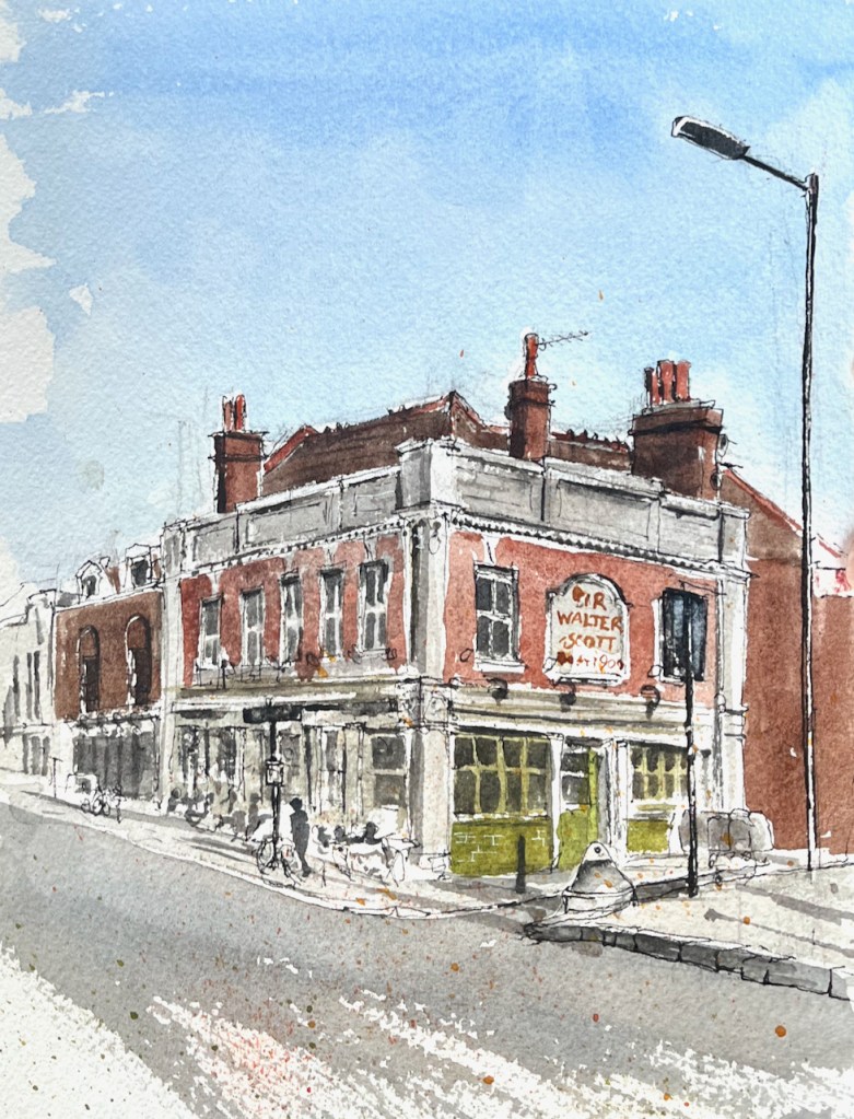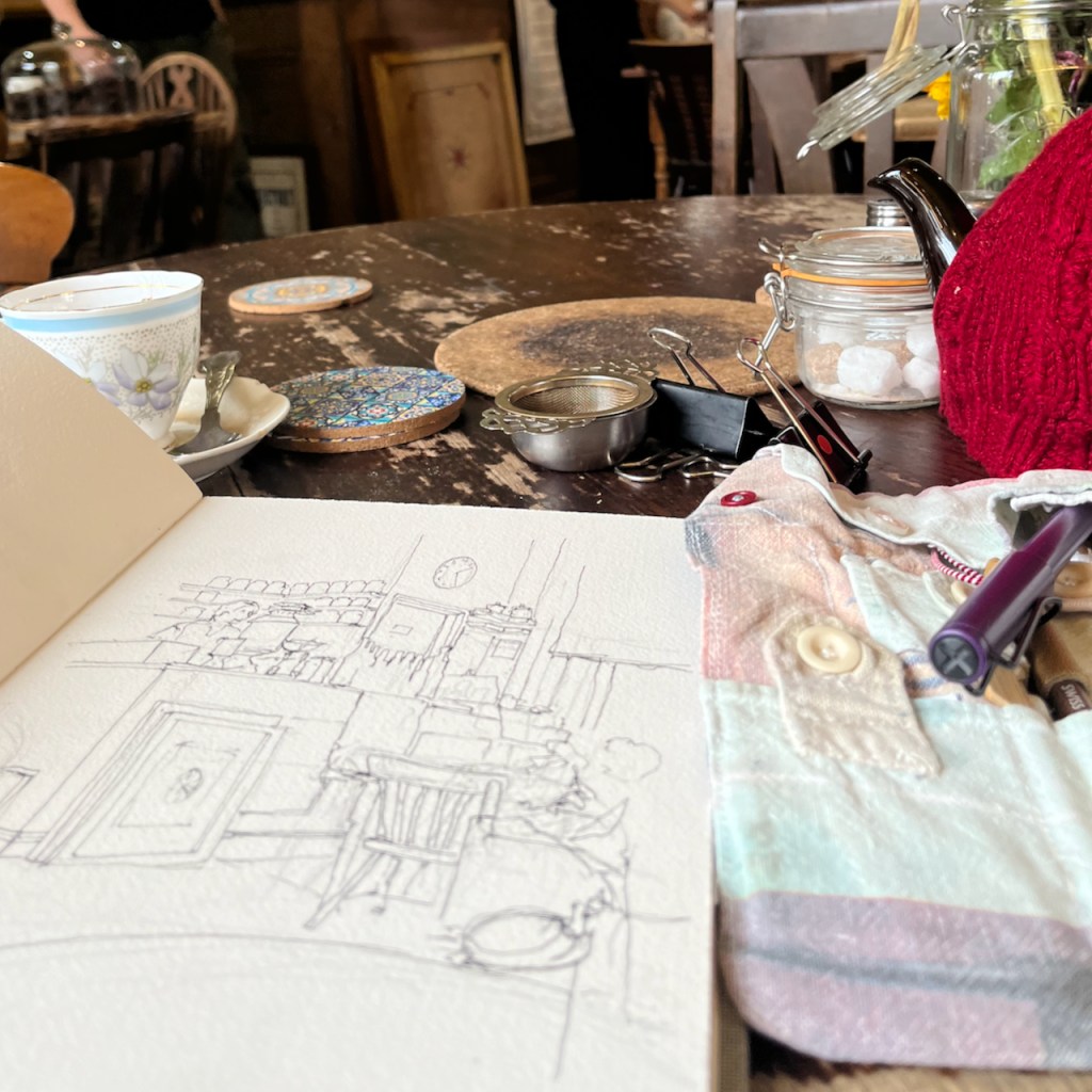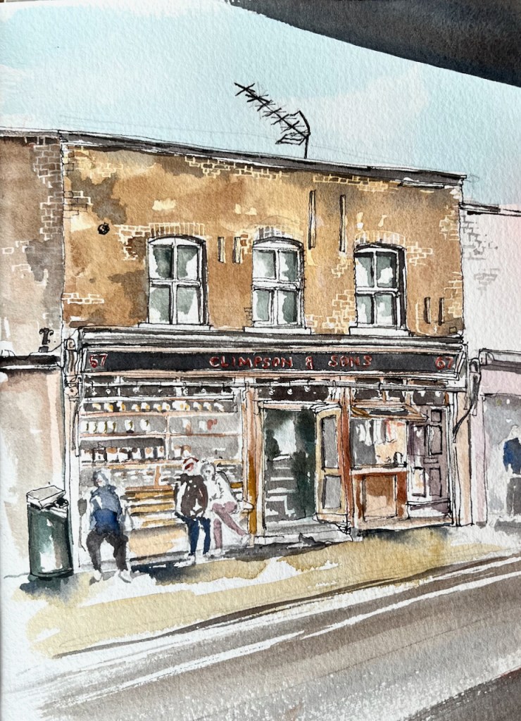 Toby, it turns out, is in charge of a café. He was standing on the pavement next to a huge arch by the Victorian frontage. Come in! he suggested. Lynn and I followed him through the arch. The space opened out into a large yard, with seats. Toby went into his café and we walked around the yard, sizing up the artistic possibilities. Lynn uttered a shriek of delight. She had discovered a point at the edge of the courtyard with an unexpected view of The Shard. And trees. This was her quest. She settled down to sketch while I went to procure coffee from Toby and his team. Then I started sketching too.