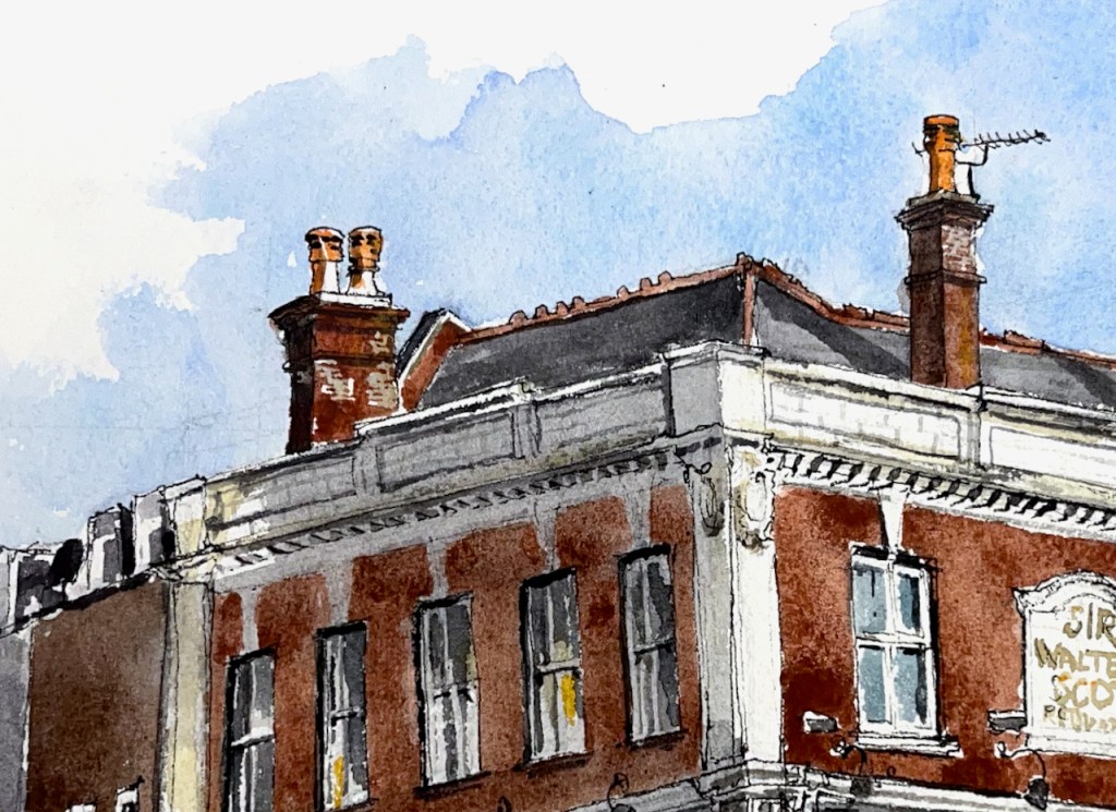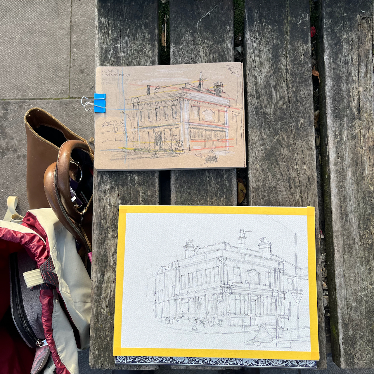My idea had been to sketch the front of the Victorian building from Weston Street. But the front was obscured by delivery vans.