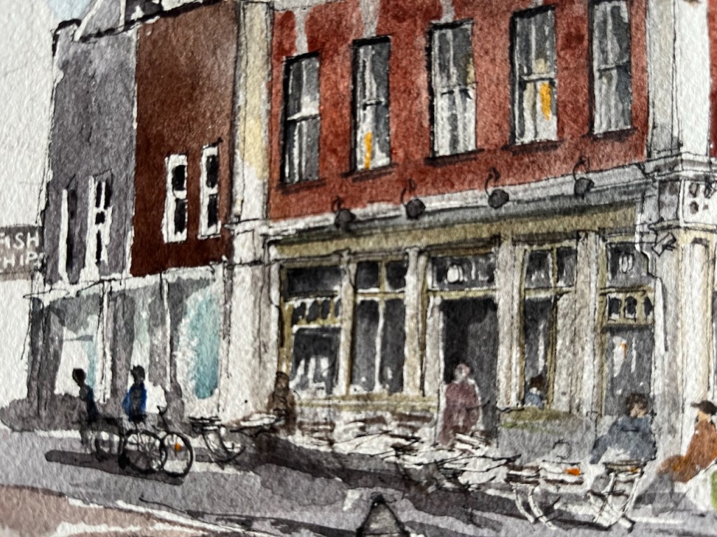 From the café “Morocco Bound” I sketched the distinctive building across the street. This is 2 Leathermarket Street: In the distance you see The Shard, at London…