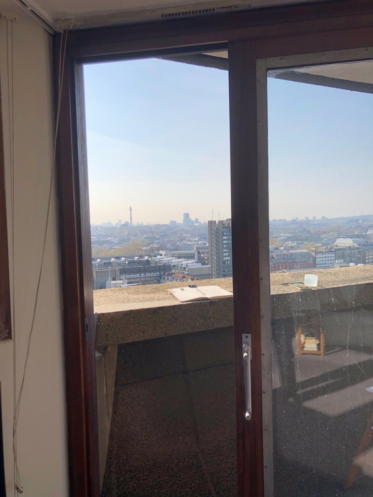 The tower in the foreground is part of Frobisher Crescent. Frobisher Crescent itself is on the left. Ben Jonson House is on the right. On the horizon you can see Centrepoint, and the Post Office Tower.
