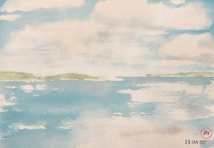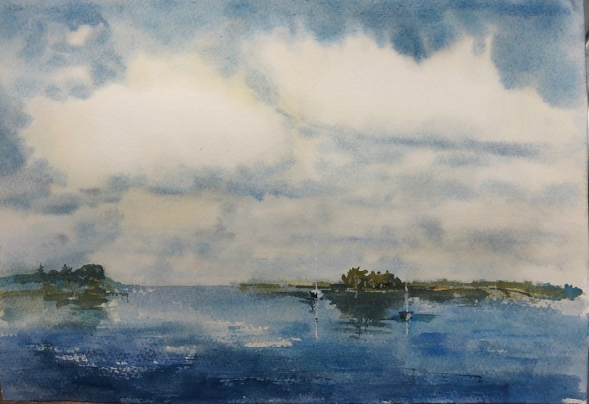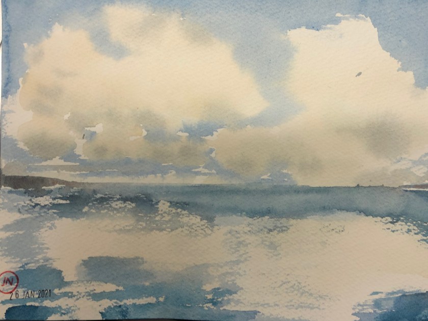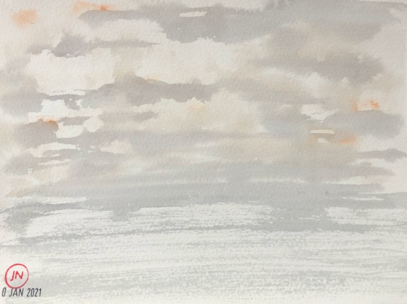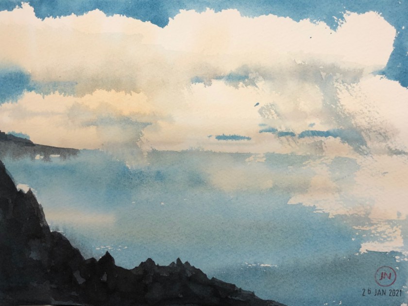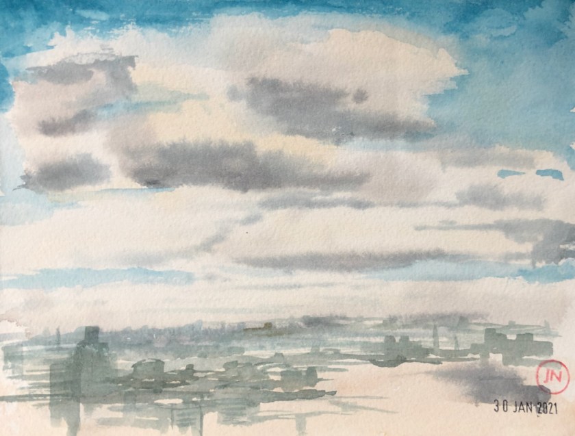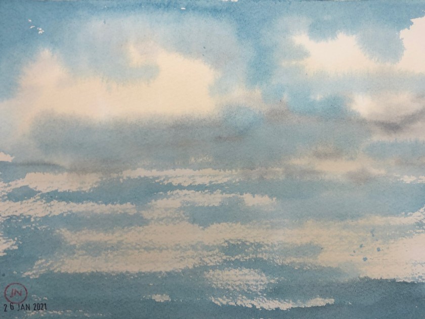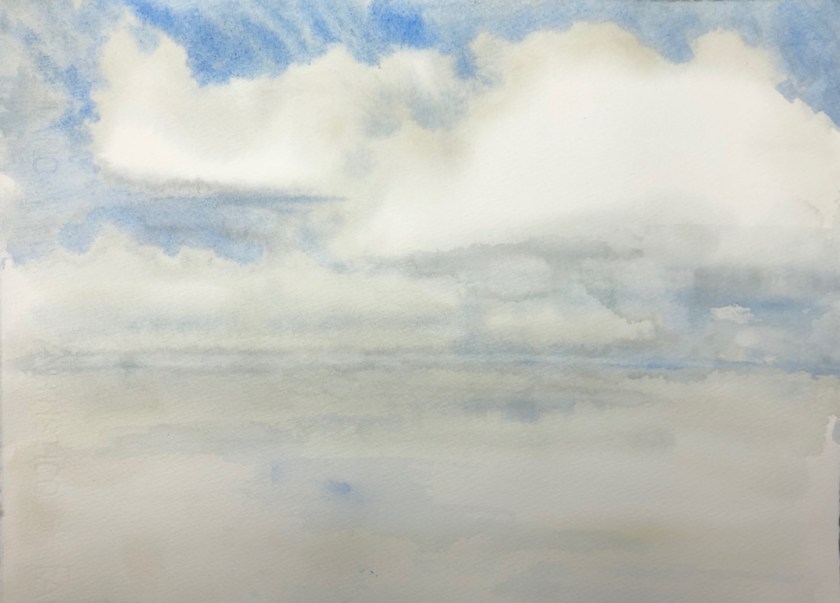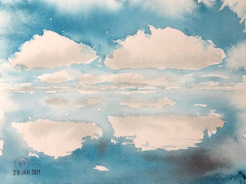 Here is a collection of cloud studies. This is me experimenting with “wet on wet” watercolour technique, from my desk. Click the image to see it bigger.