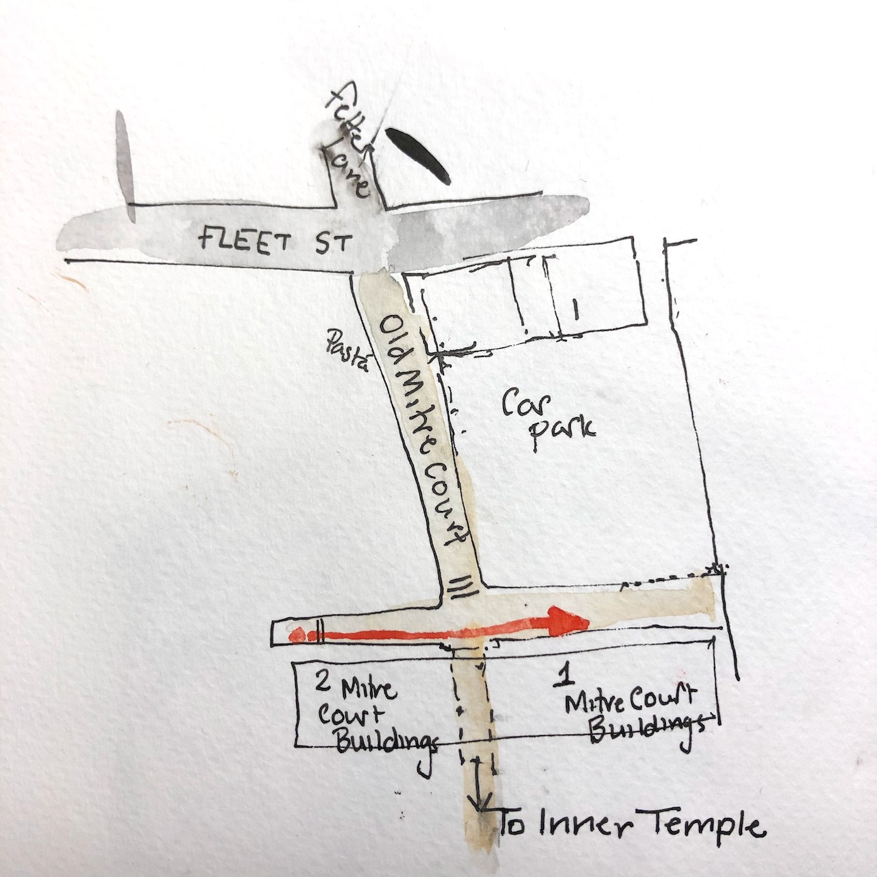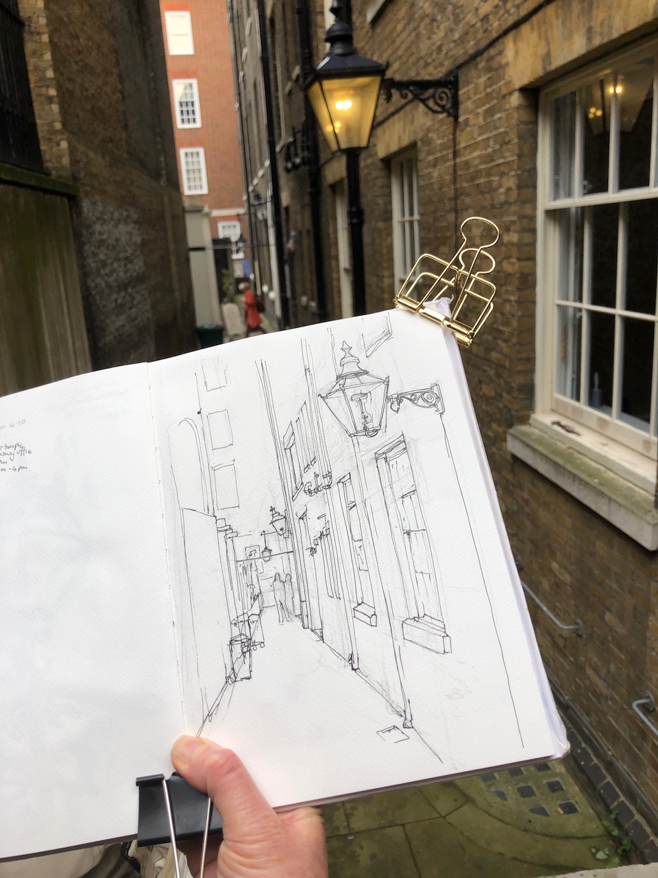 Carting Lane runs down from the Strand to the Thames Embankment, right next to the Savoy Hotel. I drew the picture standing above the lamp, looking down the lane towards the Thames. Here’s a map.