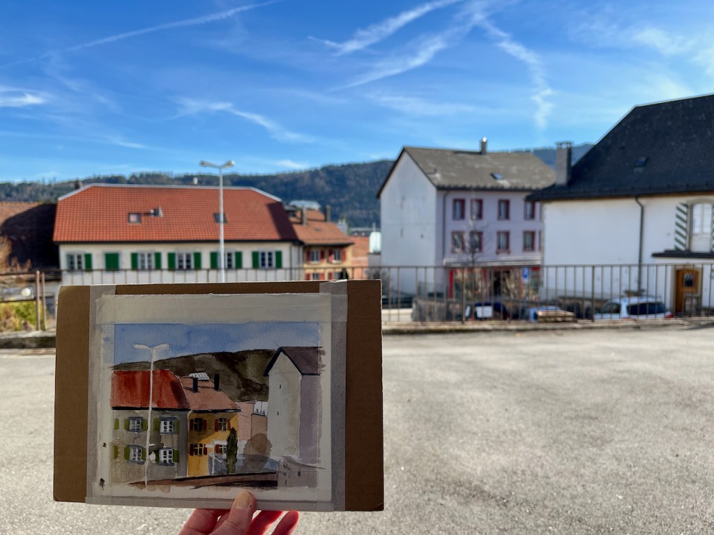 Sainte-Croix houses, 8″ x 6″ postcard on Arches Aquarelle 300gsm paper. March 2024