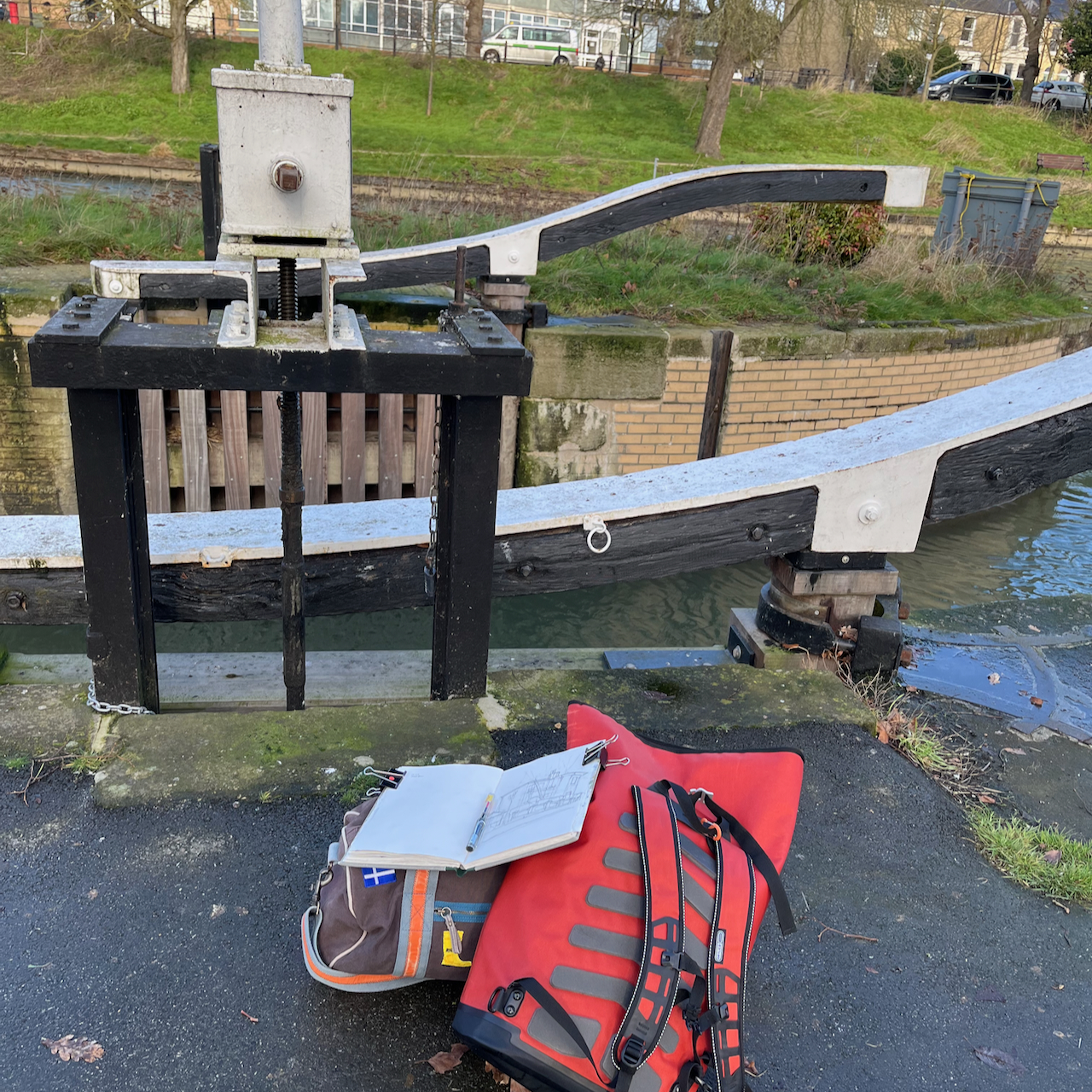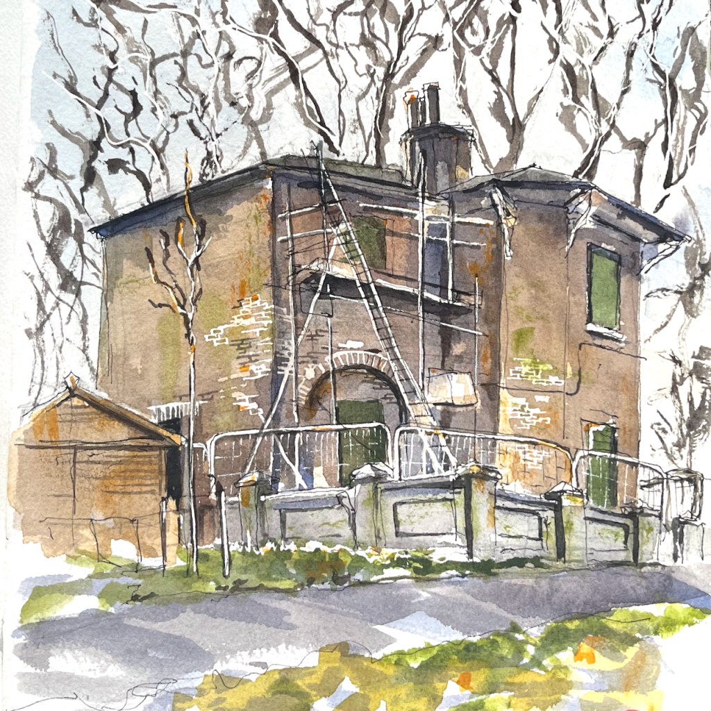 Jesus Green Lock House being renovated. Sketched from Jesus Lock, 24 January 2025, in sketchbook 15